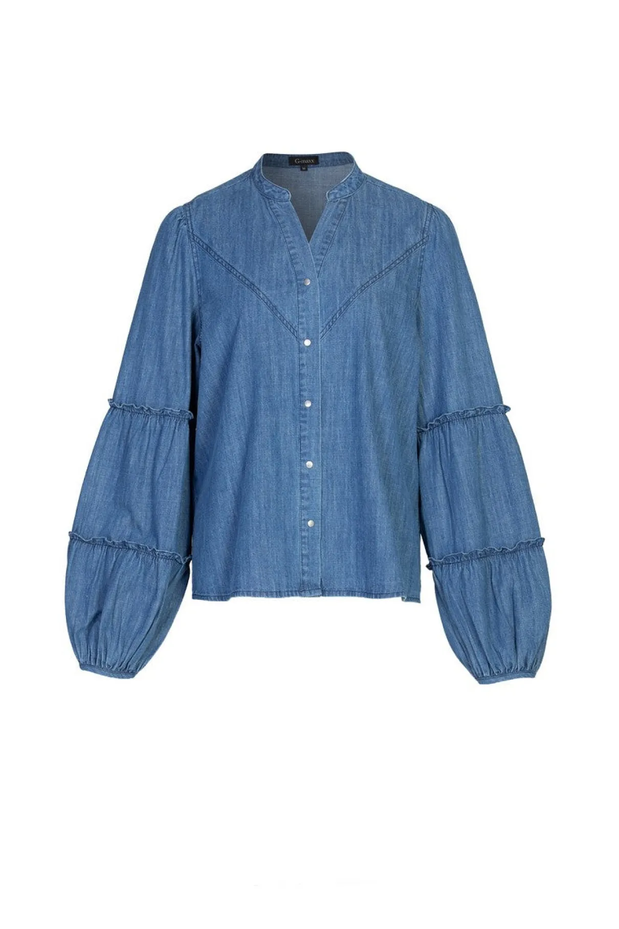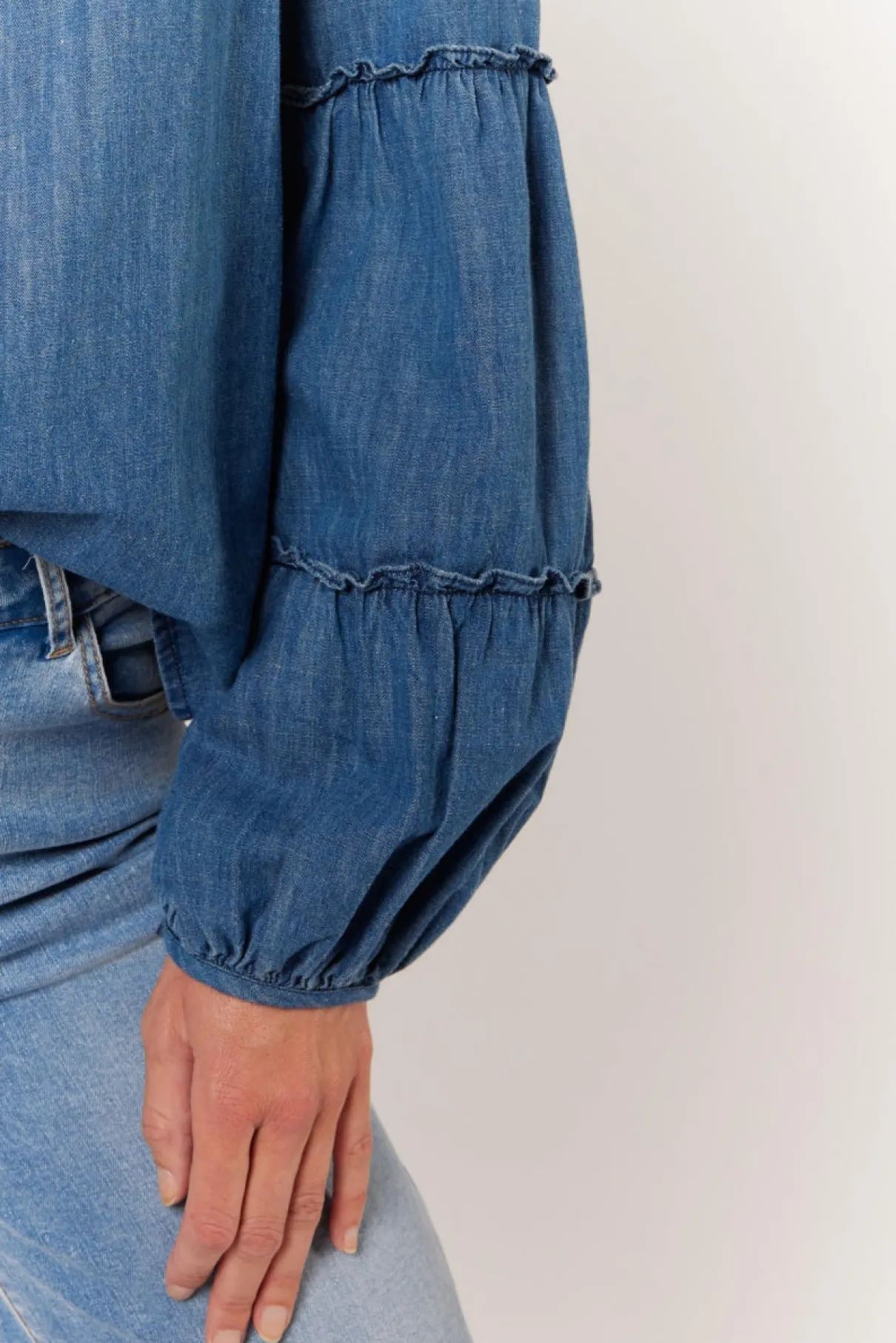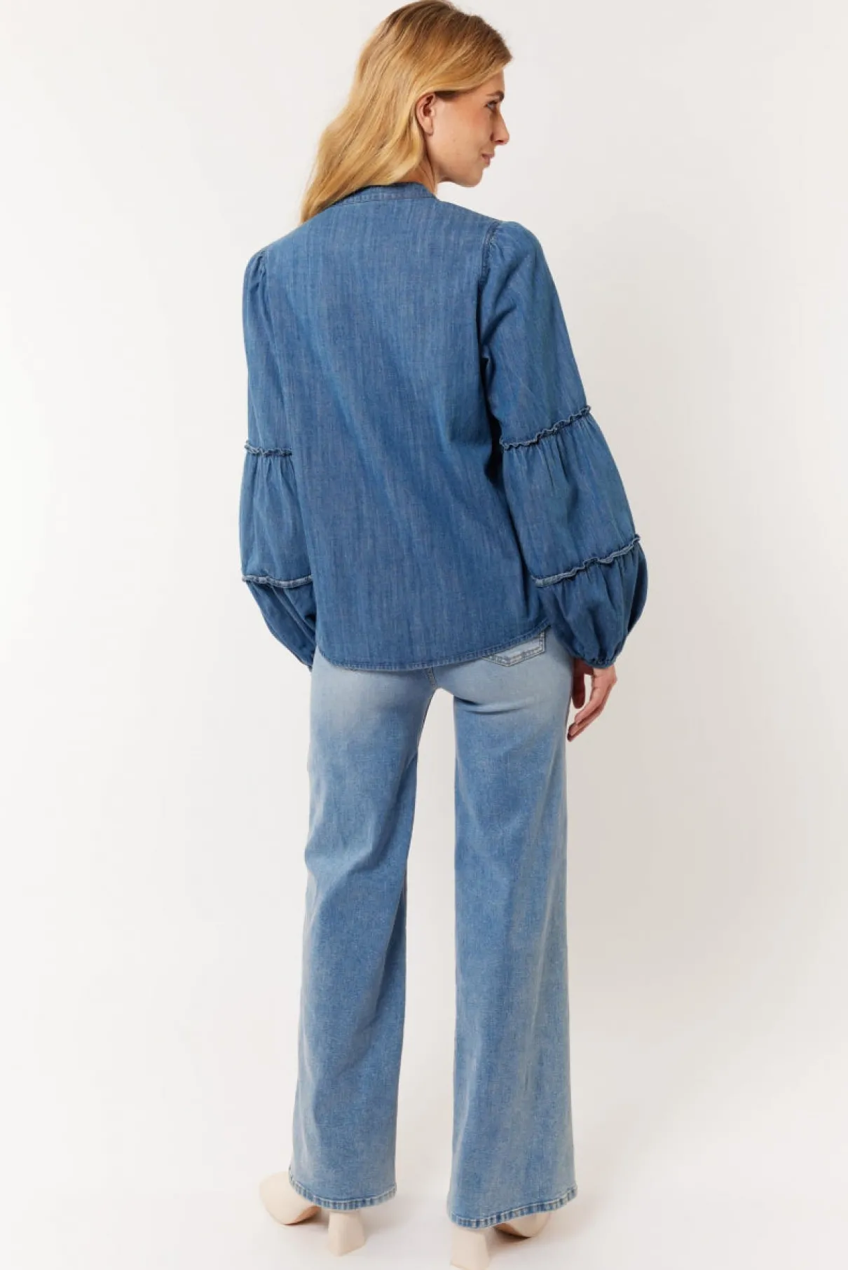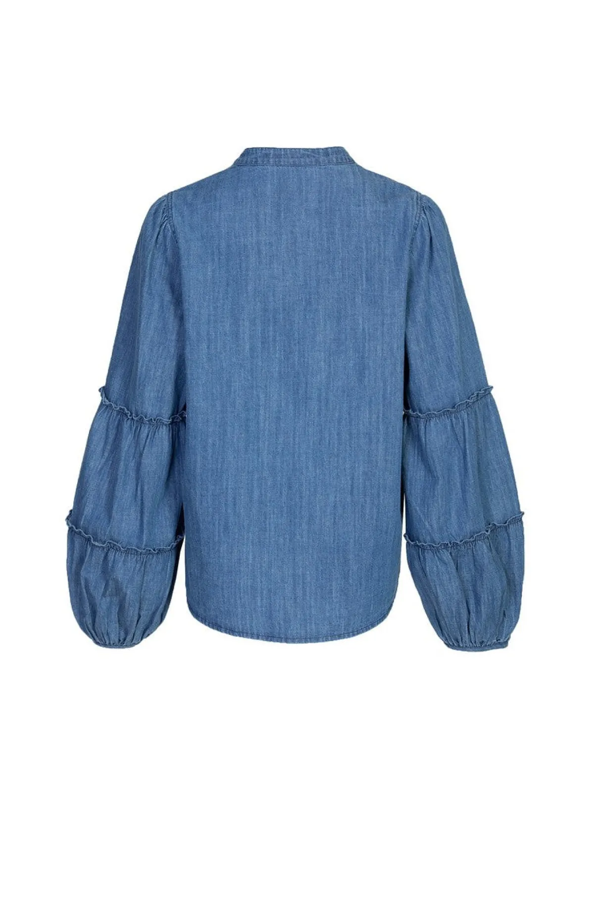 De eindeloze trend van denim laat ook dit najaar haar gezicht zien. Zo dragen we de Aimy blouse in deze populaire stof, voor een casual en modieuze look. De blouse heeft een recht model met speelse ballonmouwen, voorzien van een subtiele ruffles. De blouse wordt gesloten middels drukknoopjes.