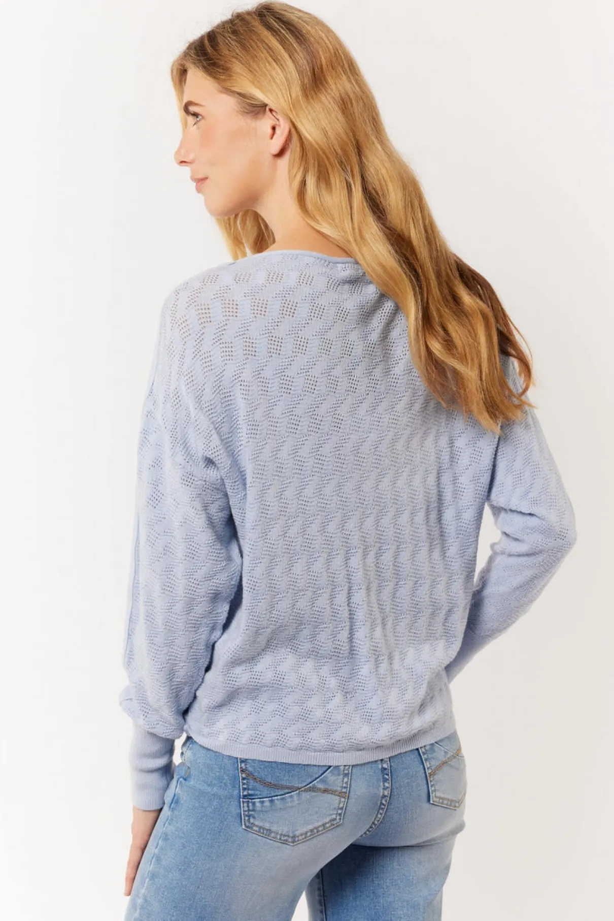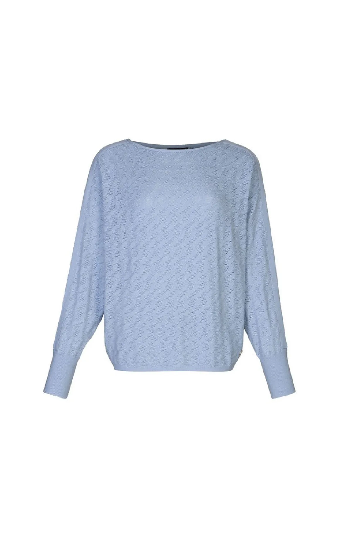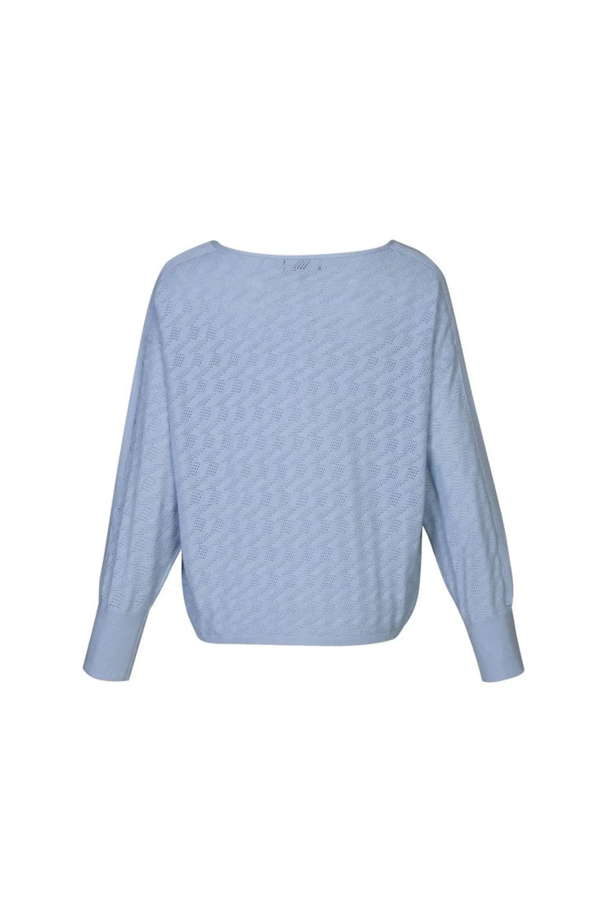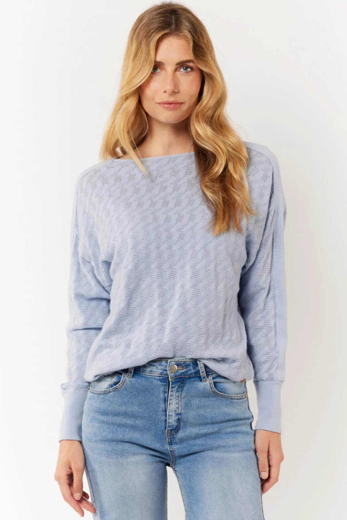Something new, something blue. Lichtblauw is een frisse wind door de najaarsgarderobe. De fijne Alison trui heeft een losvallend model met een chique boothals, een gebreid motief en een streepdetail op de mouwen.