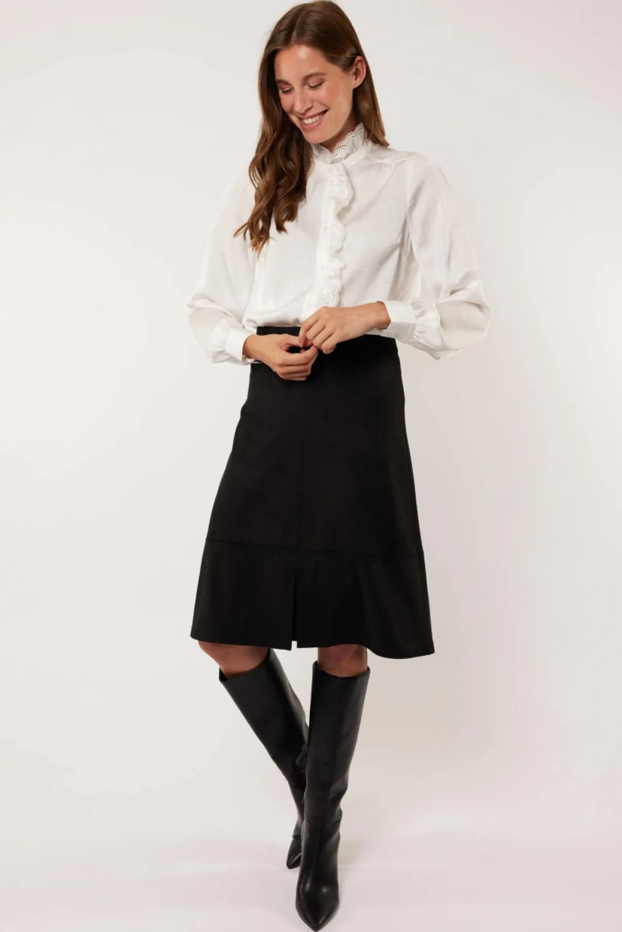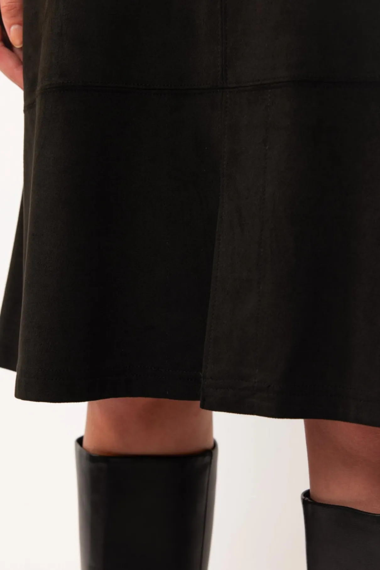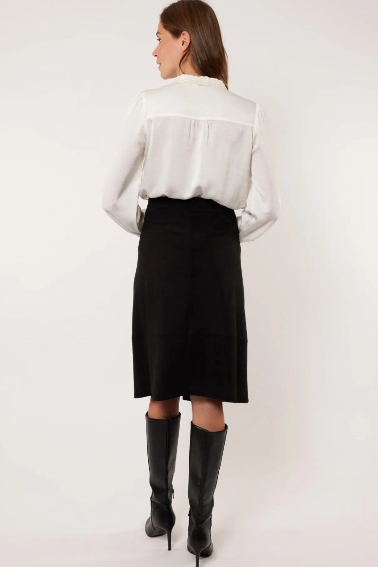 Een klassiek G-maxx materiaal is suedine, de diervriendelijke variant van suède. De Allessandra rok is gemaakt van dit materiaal en heeft een halflang model tot de knie met een split aan de voorzijde.