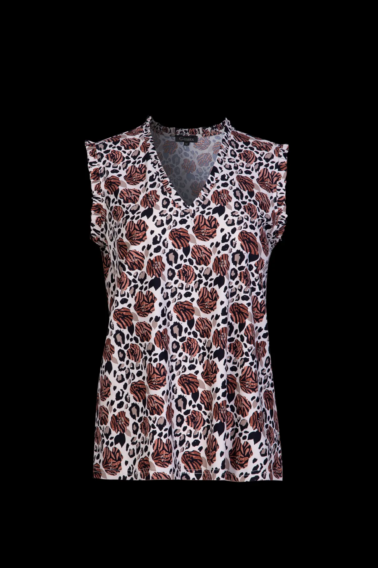 Kleurrijke dessins geven een boost aan de zomergarderobe. Zo ook de print van de speelse Angely top. Deze top heeft een recht model met ruffles op de schouders en is voorzien van een kleurrijk dessin. De top is gemaakt van travel kwaliteit en kan als set gestyled worden met de Nadien broek.