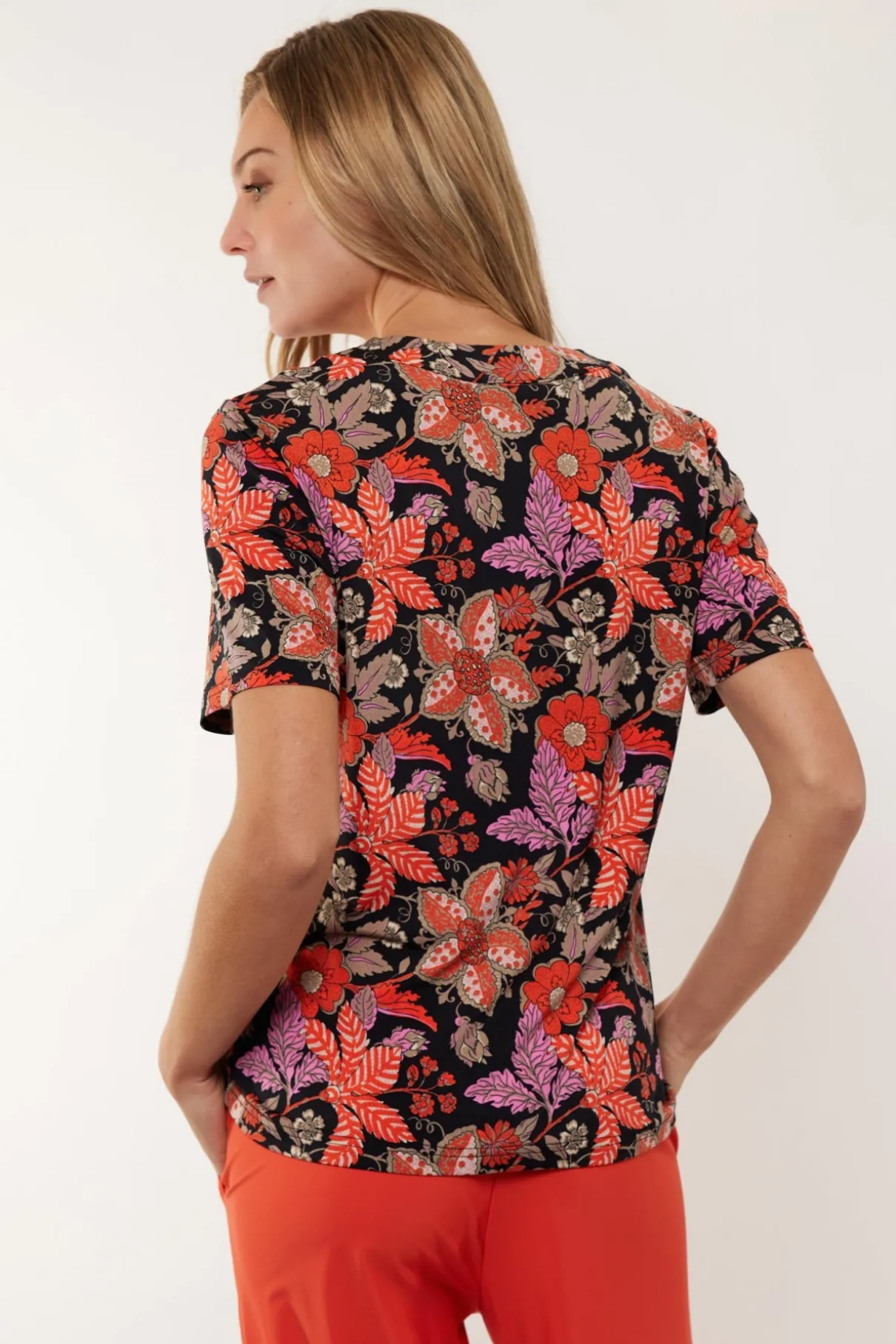 Haal het voorjaar naar je look met de kleurrijke bloemenprint van de Bibian top. Deze top heeft een recht model met korte mouwen en een V-hals.