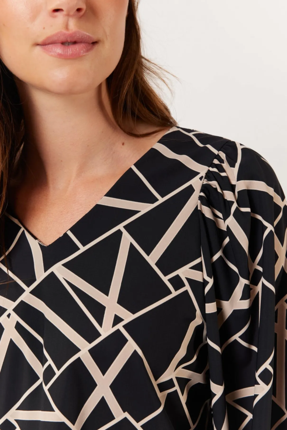 Eén van de bestsellers van dit seizoen is de zwart-beige print dat in iedere neutral-toned look verwerkt kan worden. De Bibi blouse is gemaakt van travel kwaliteit dat zorgt voor een hoog draagcomfort. De Billie top heeft een losvallend model met een mooie V-hals en een striksluiting langs de onderzijde om de top te laten bloesen. Deze top is als complete set te stylen met de Bindi broek.