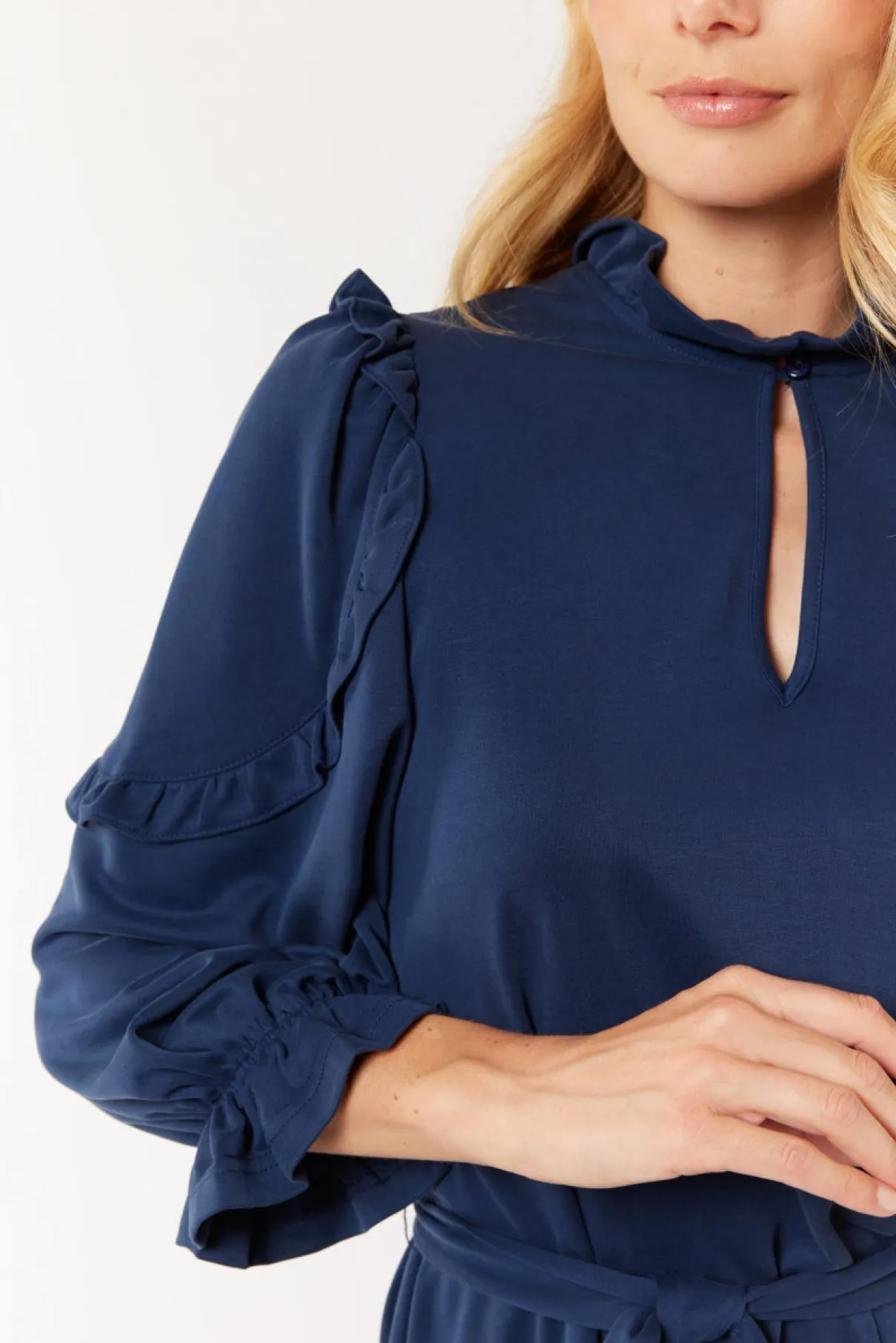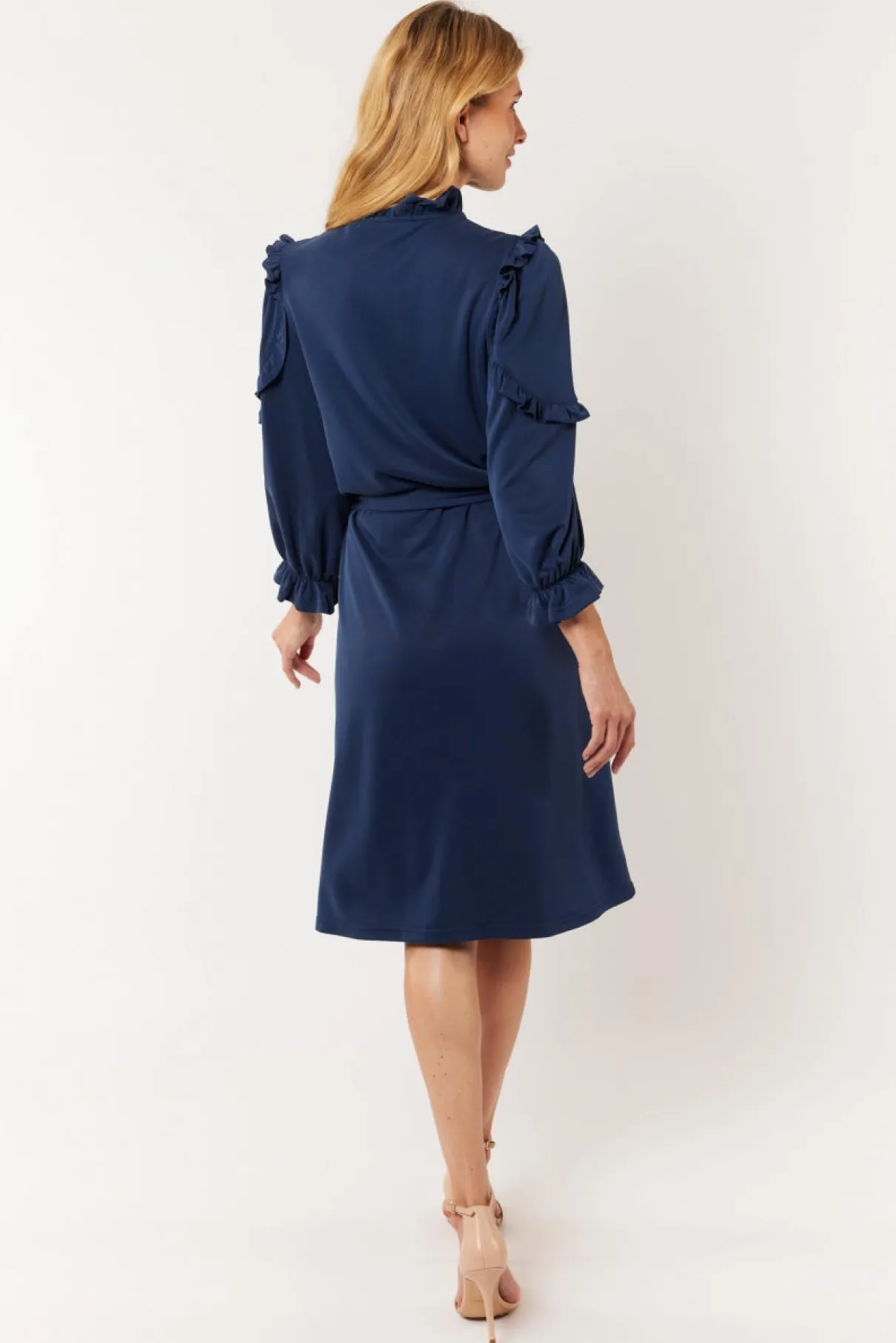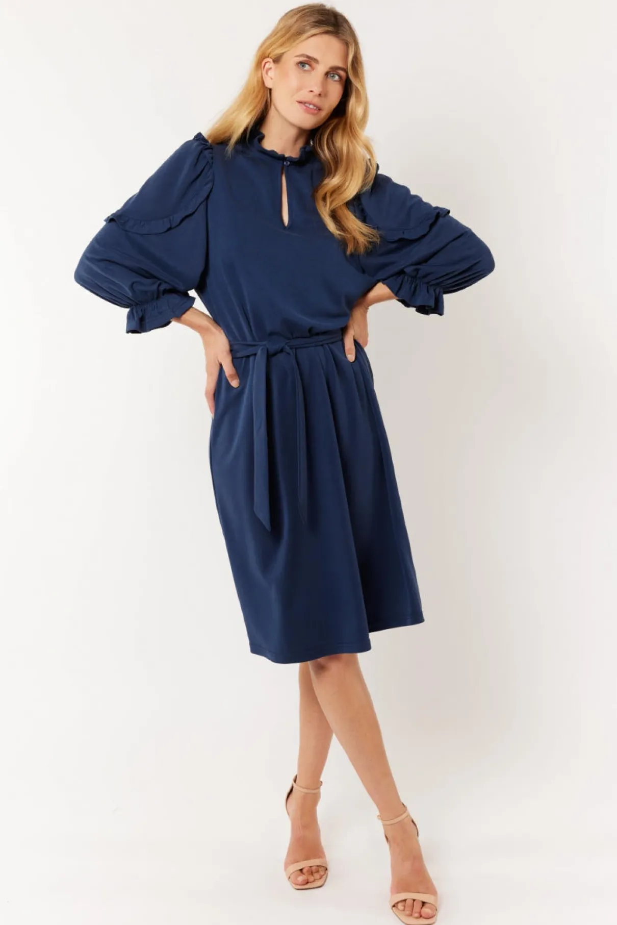 De Brenda jurk is er zo een dat geschikt is voor meerdere draagmomenten. Deze chique als comfortabele jurk heeft een halflang model met ruffles op de mouwen en in de kraag. Accentueer het vrouwelijk silhouet met de strikceintuur rond de taille.