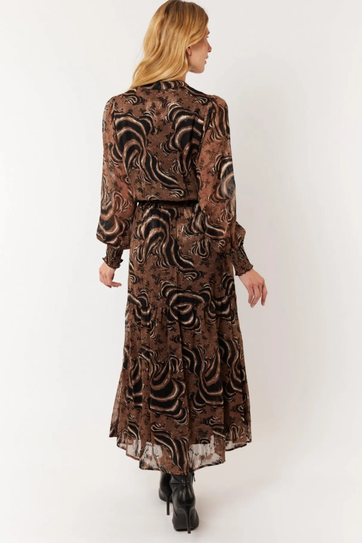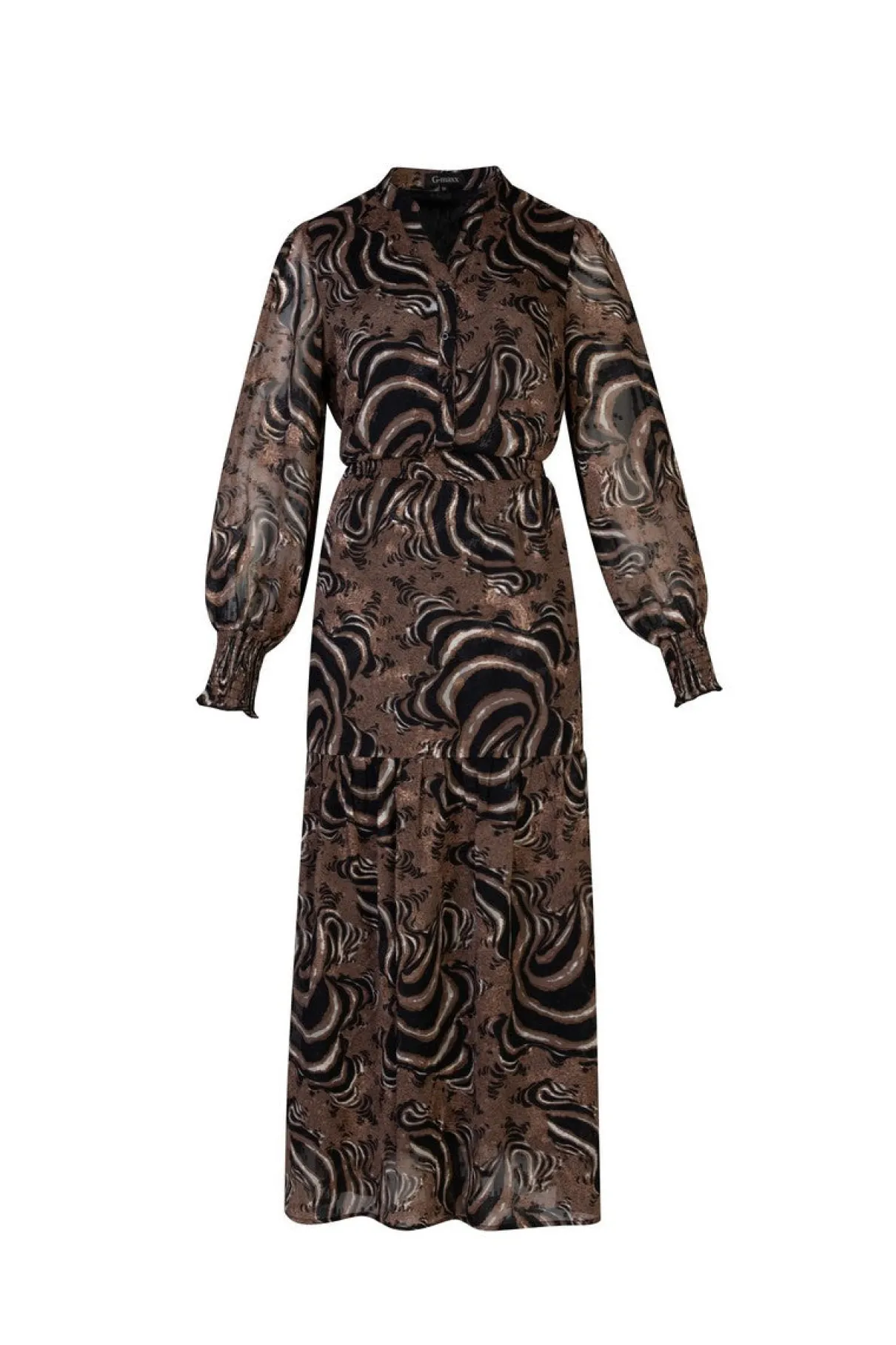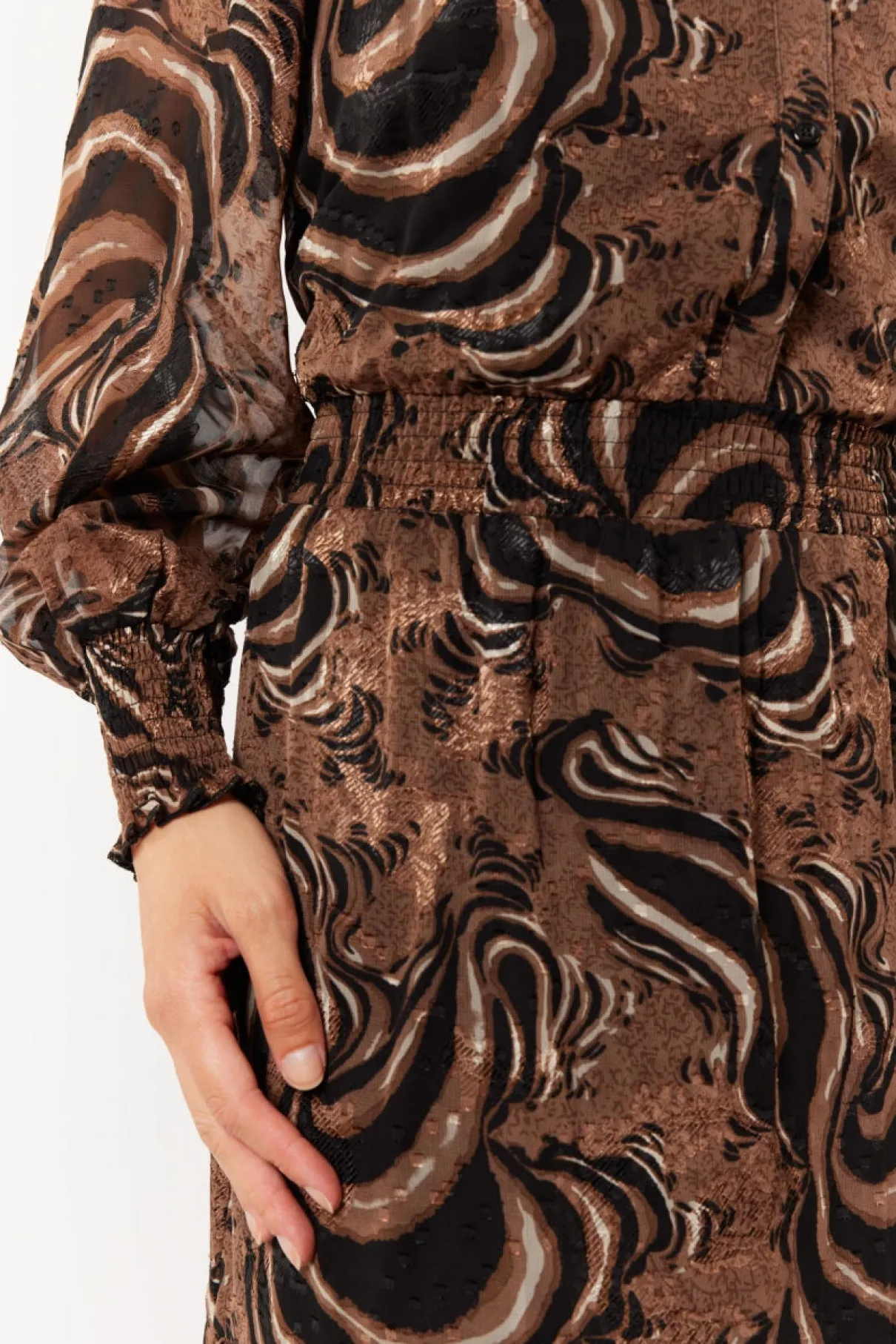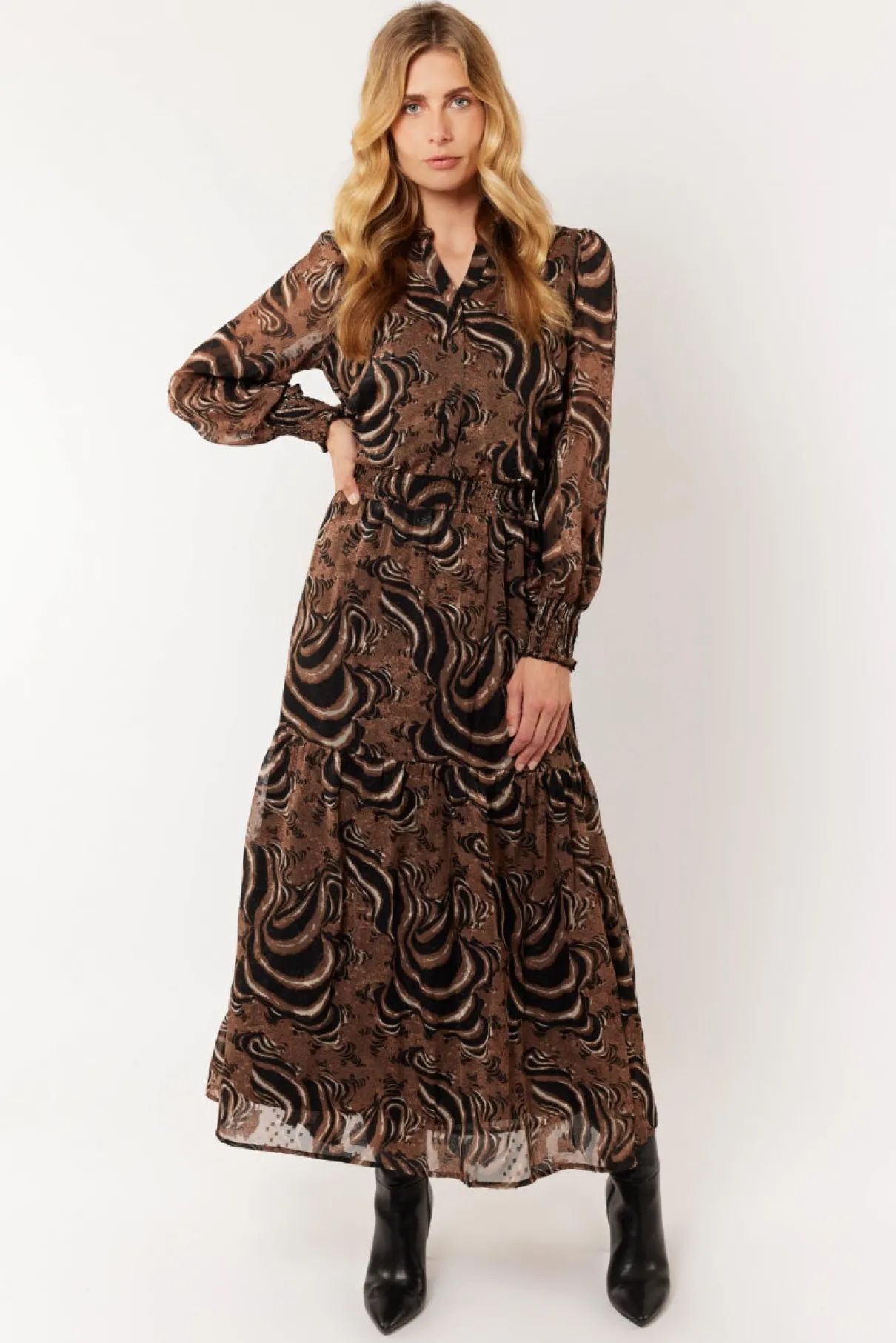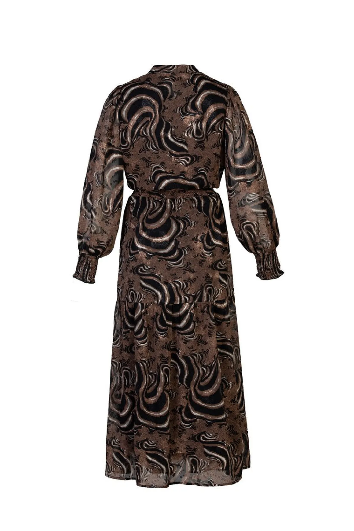 Eén van Froukje’s favorieten van dit najaar is de Brinn jurk. Deze losvallende maxi jurk beweegt met je mee door de lichte mesh-stof, voorzien van een weelderige bruine print. De jurk geeft een vrouwelijk silhouet door de elastieke tailleband en de mooie V-hals.