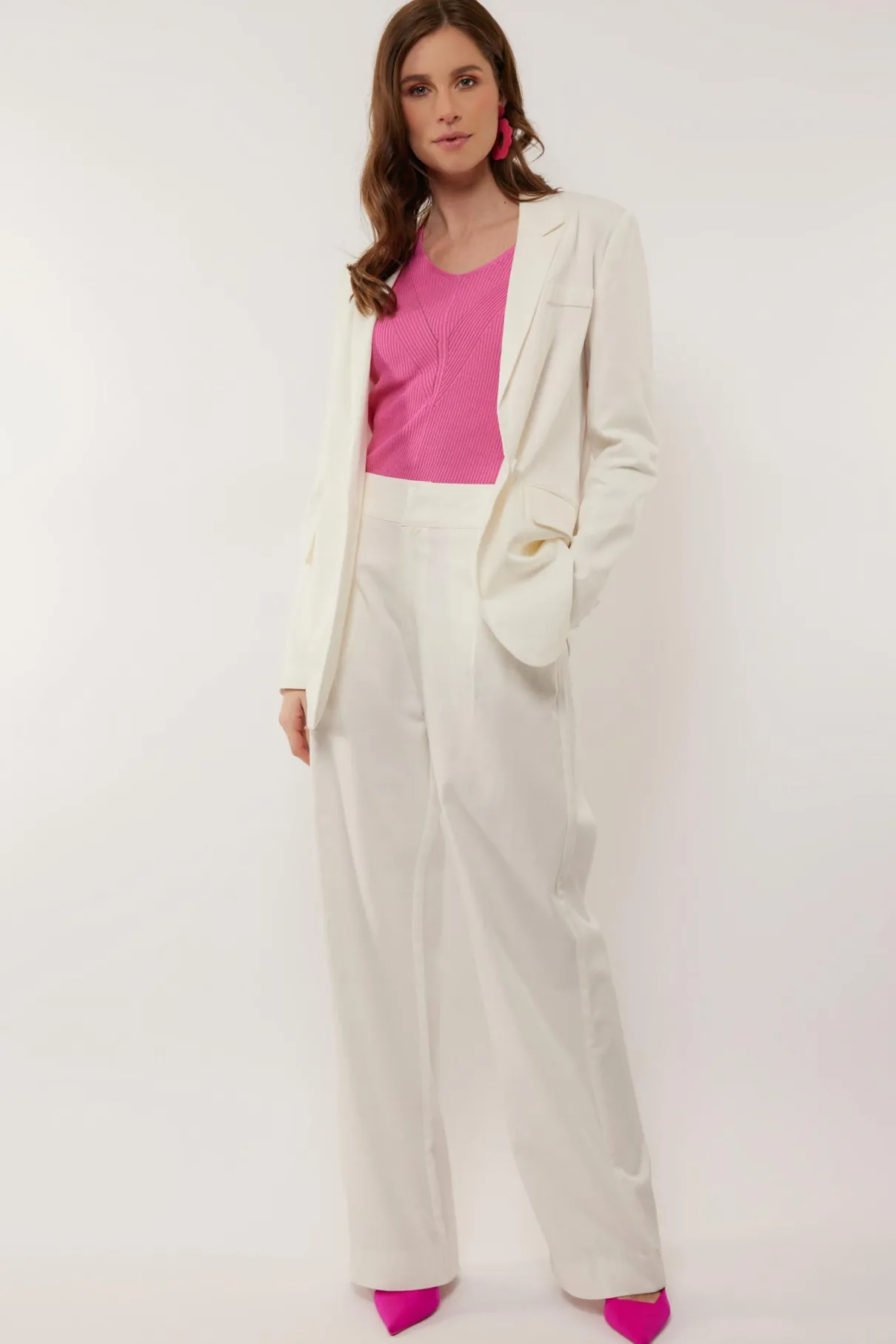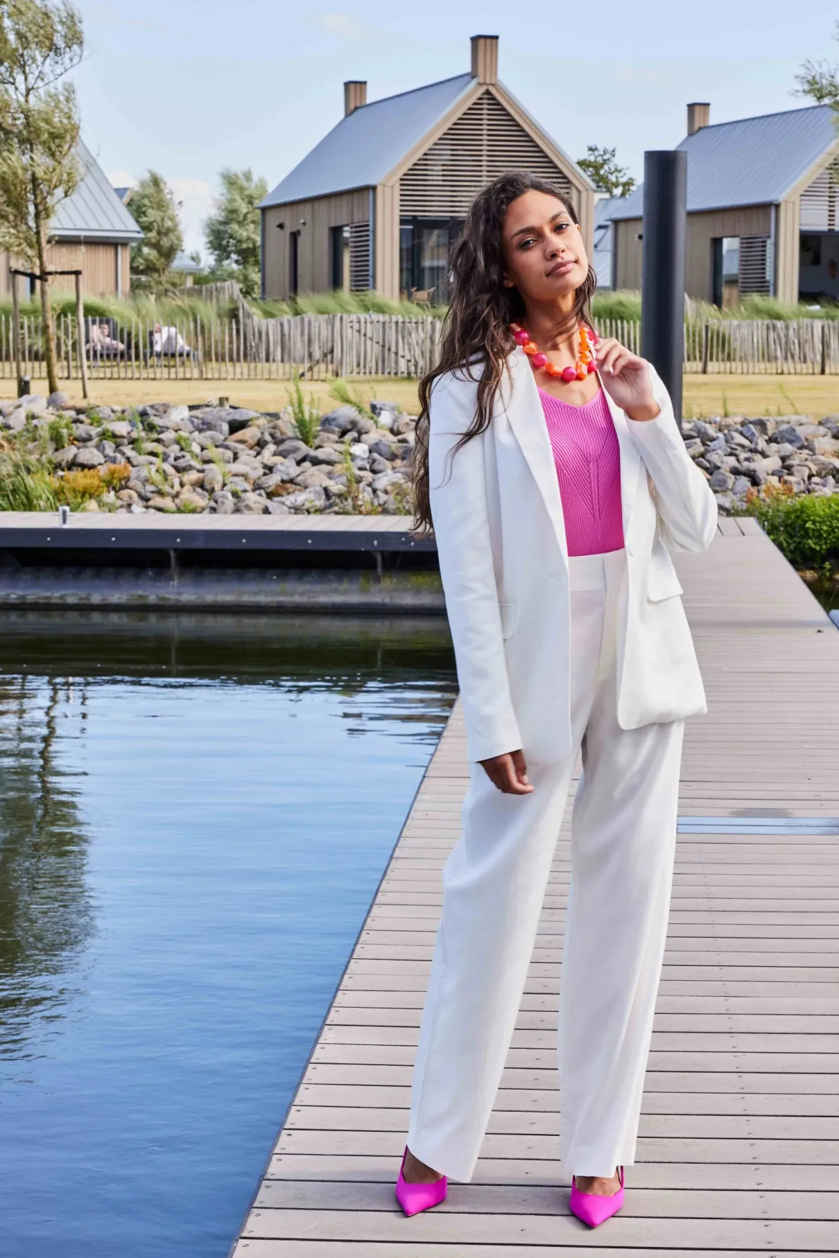 Ga deze zomer op chic met de witte Chelsey broek. Deze broek heeft een elegante wide-leg model en is voorzien van steekzakken, riemlussen en een haak- en knoopsluiting. Maak je look af door deze broek met de Zammi blazer te stylen.