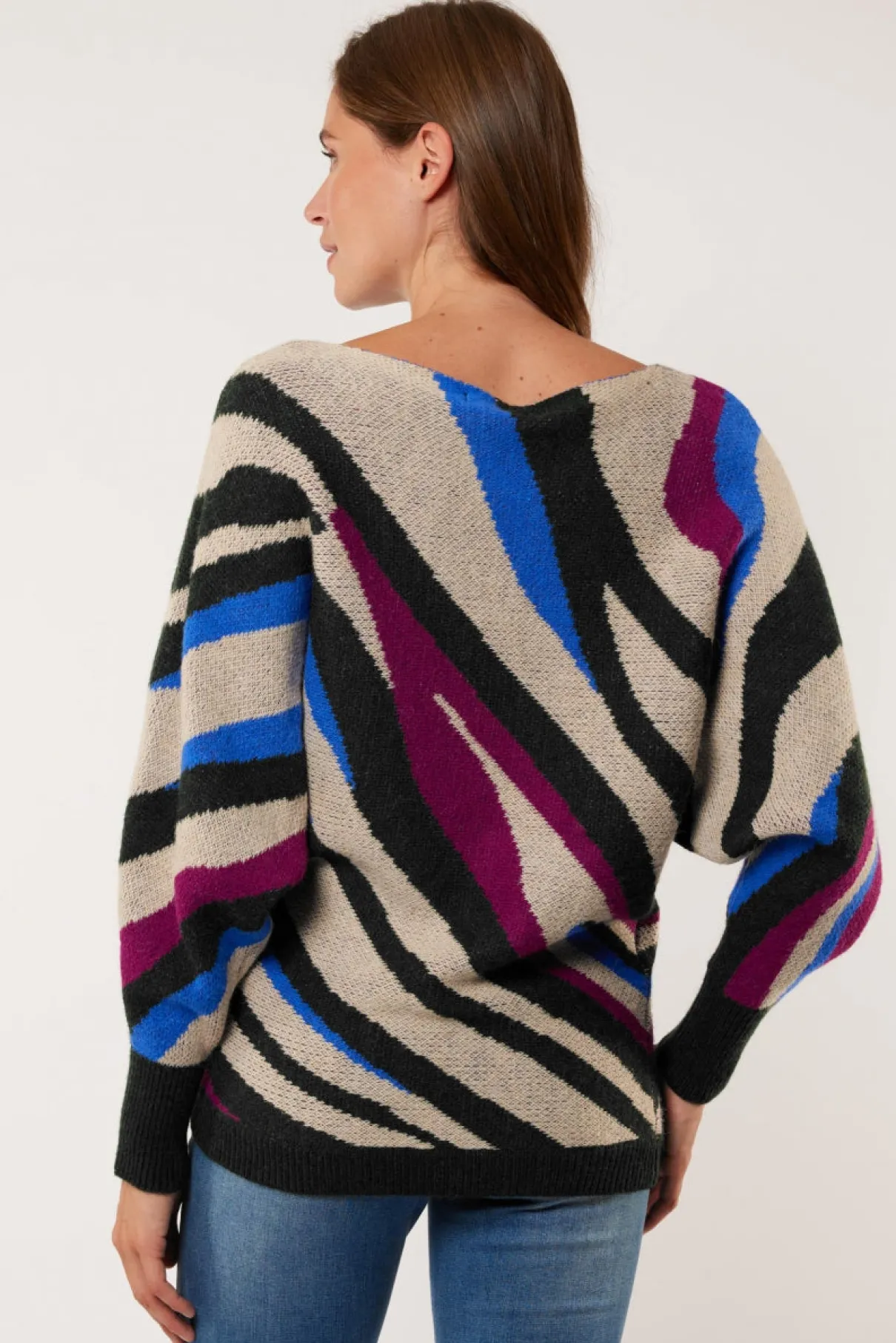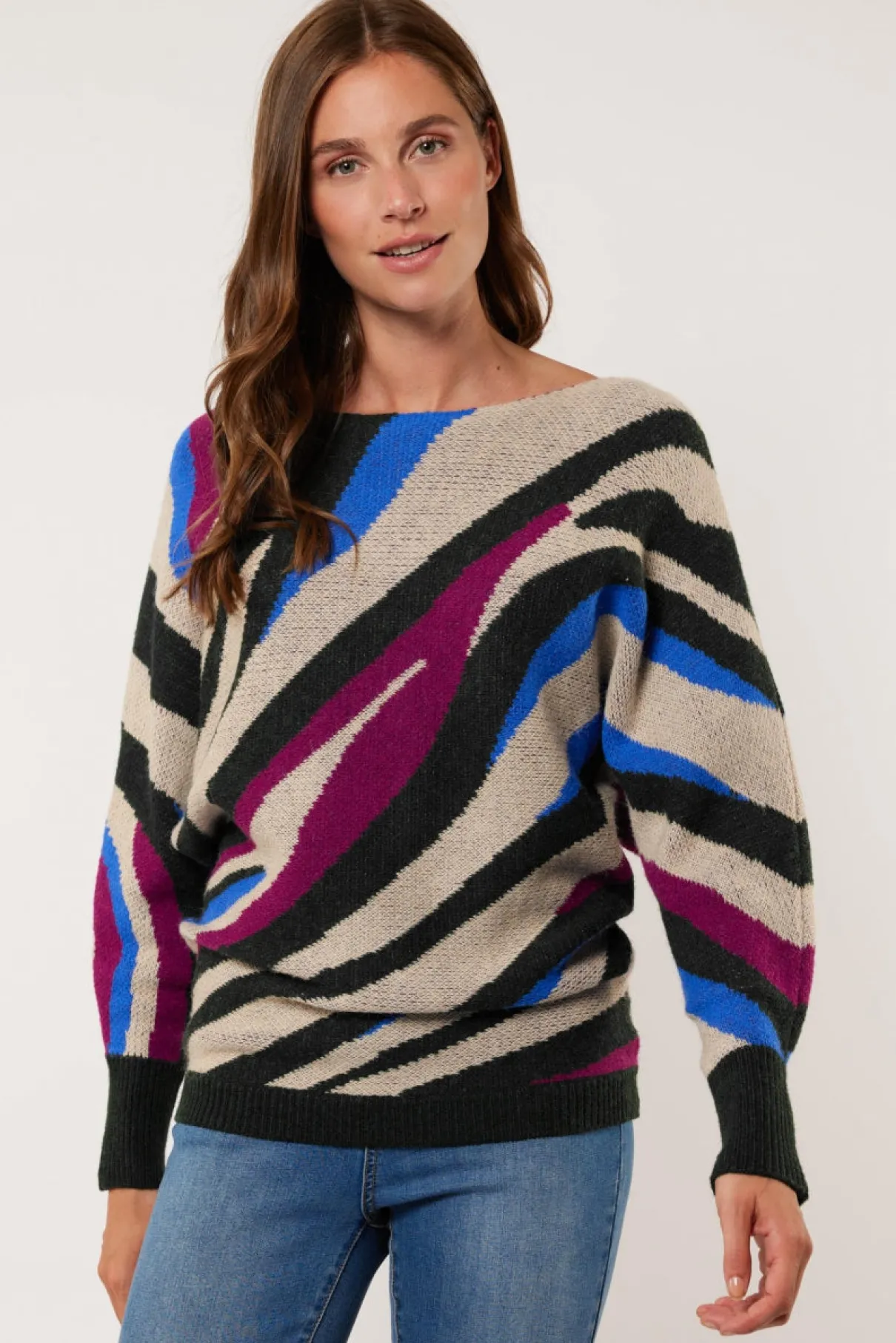 Eén van Froukje’s favorieten van deze winter is de kleurrijke Dalia trui. Deze fijne trui heeft een herkenbaar en terugkerend model met een mooie boothals. De gebreide trui heeft een speels lijnenspel met de trendkleuren van dit seizoen.