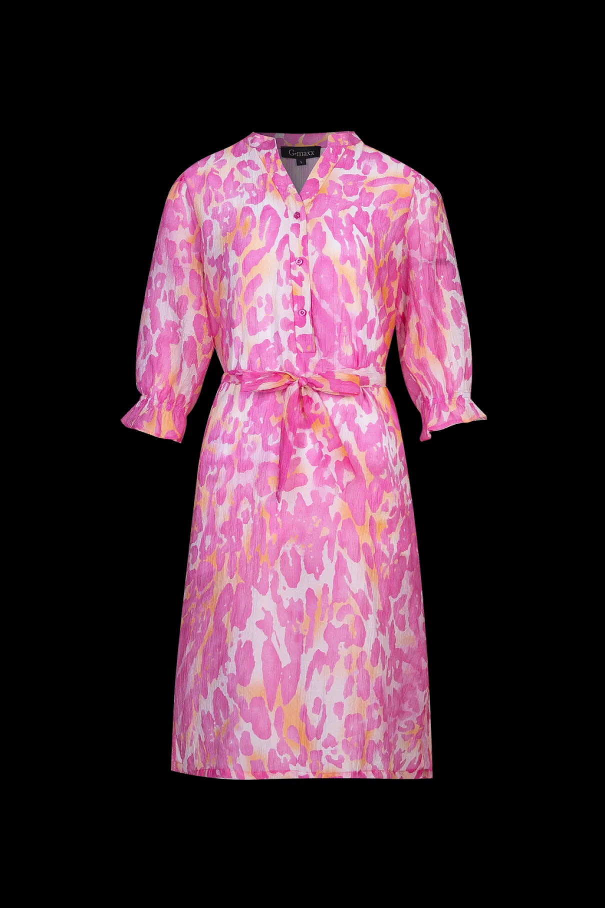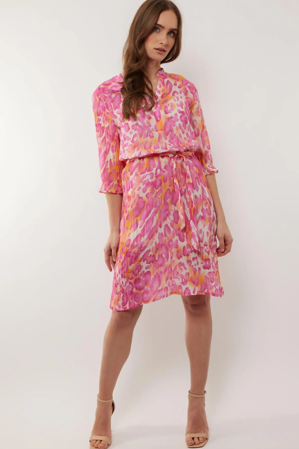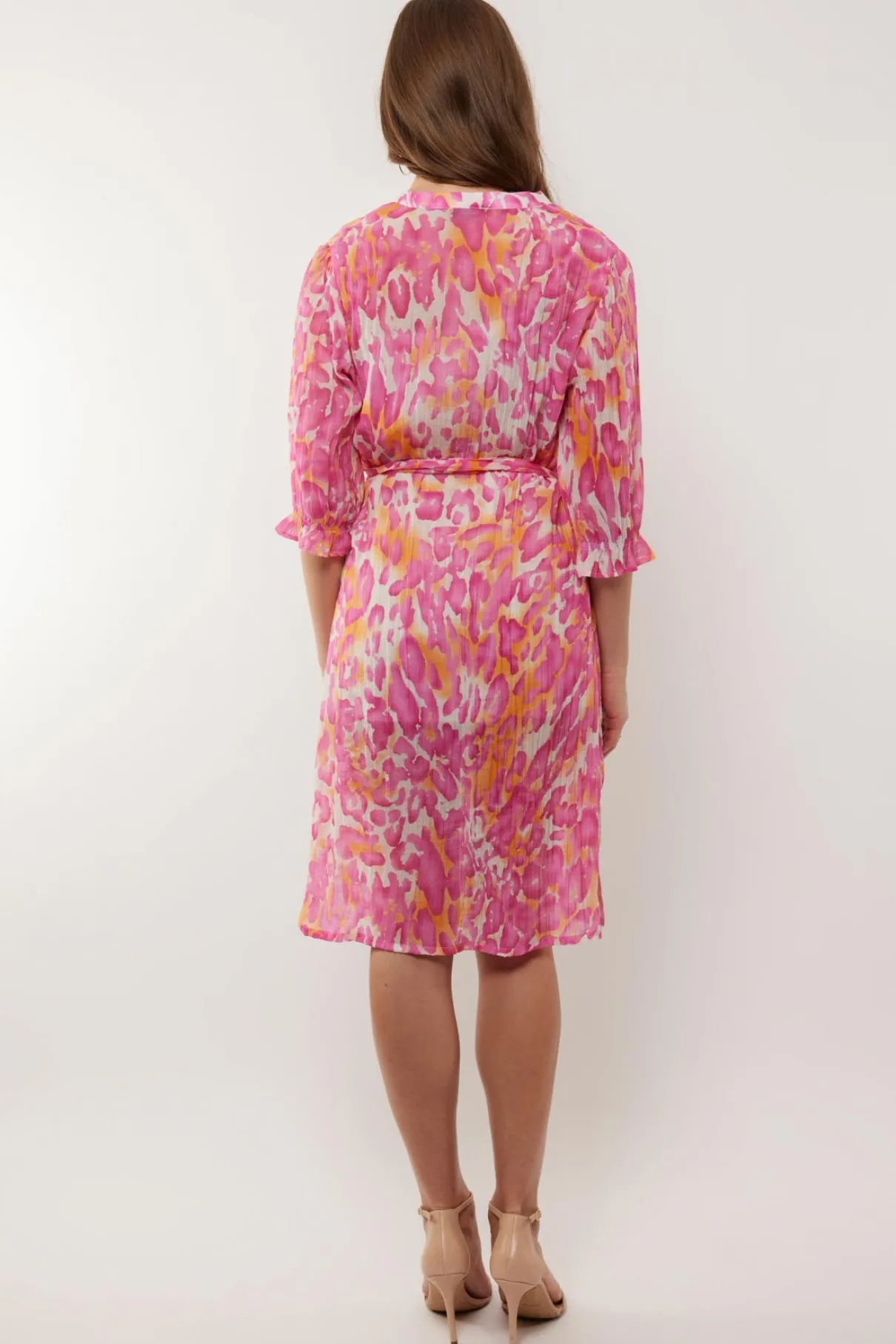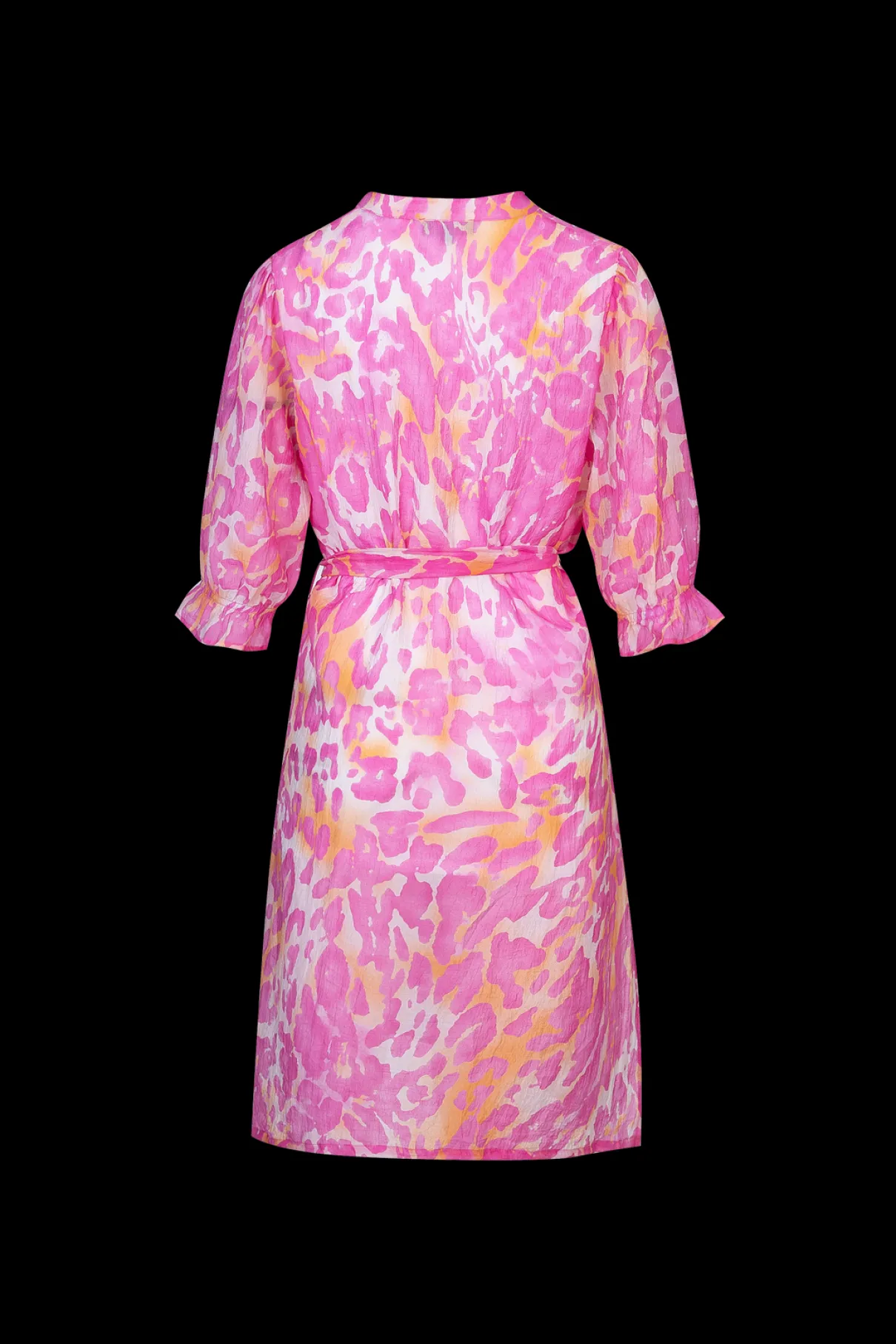 Geef je look een speelse touch met de Diara jurk, voorzien van een dierenprint. De jurk heeft een klassiek A-lijn model met halflange ballonmouwtjes, een knoopsluiting en een strikceintuur rond de taille. De jurk is gemaakt van tencel en polyamide wat een hoog draagcomfort biedt in de warme zomer.