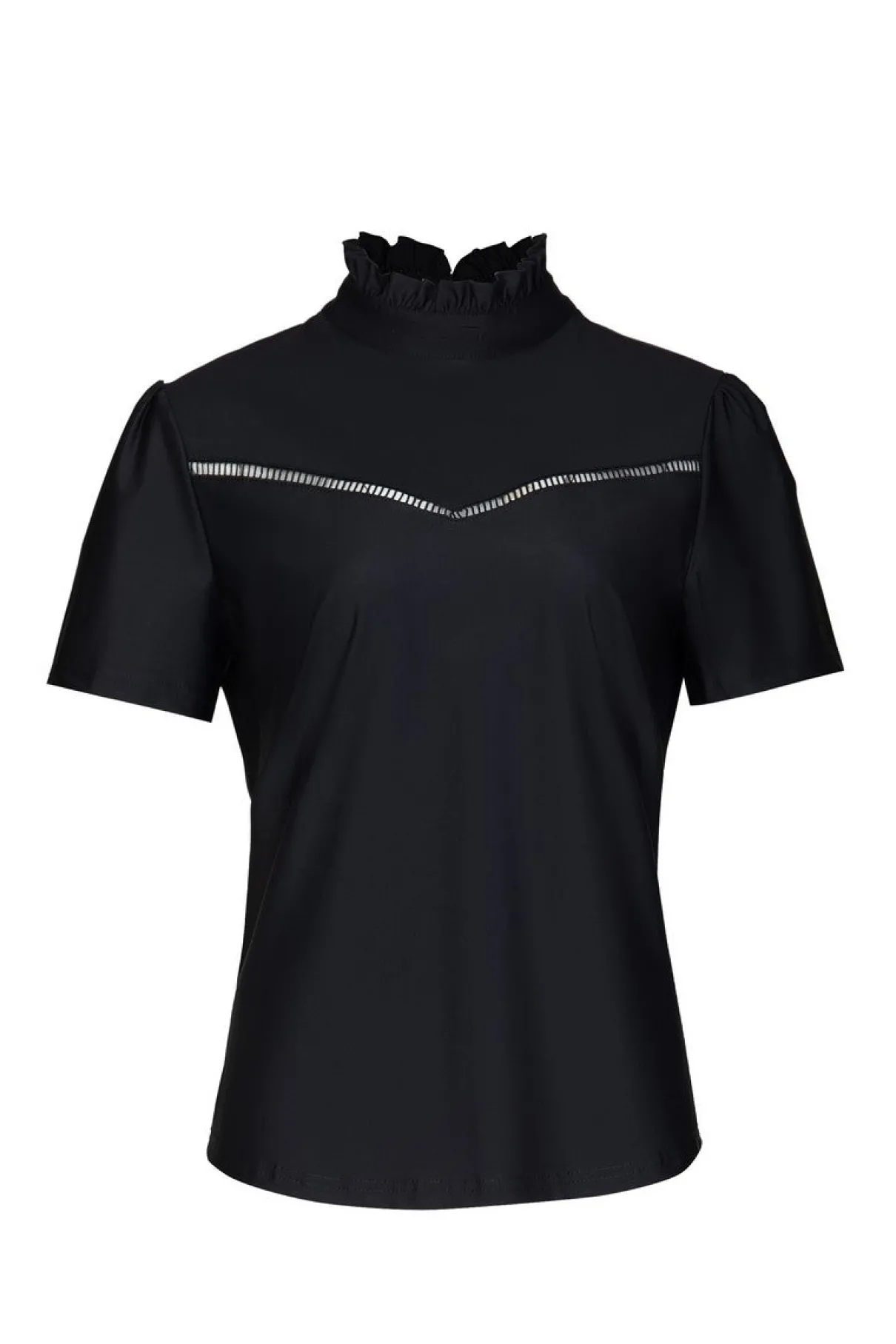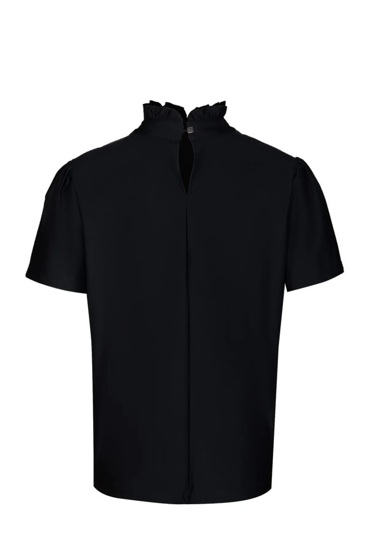 Een welbekend model binnen de G-maxx collecties is de Latoya top. Deze besteller is gemaakt van travel kwaliteit, waardoor deze een hoog draagcomfort heeft. Ook is de top voorzien van een opengewerkt detail op de borst en een ruffle kraag.