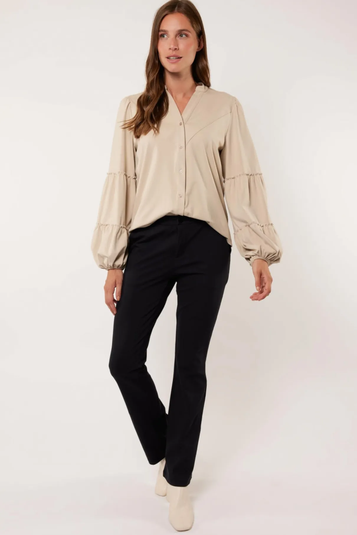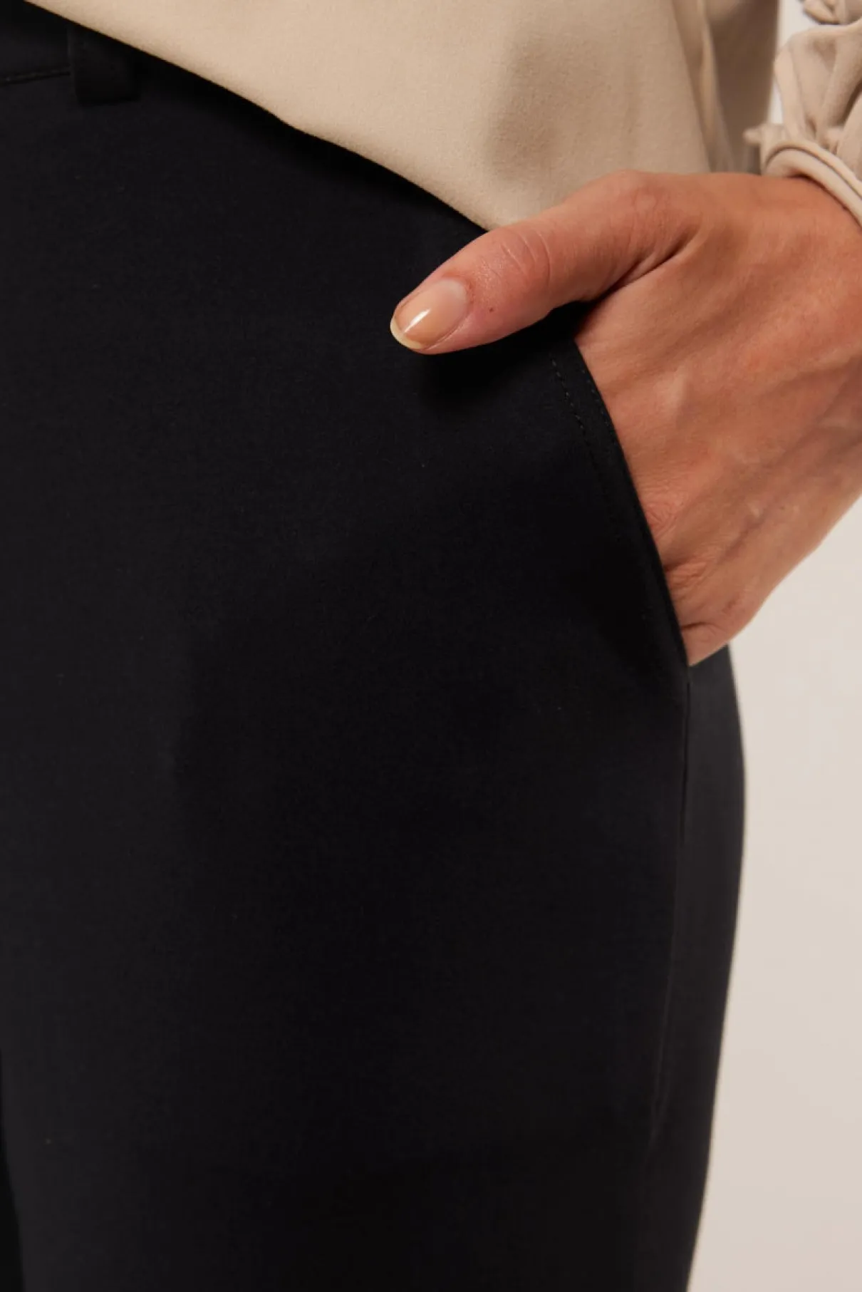 Ga voor sophisticated en duurzaam comfort met de Laurena broek, gemaakt van yoga stof. Deze broek heeft een aansluitend model met wijdlopende broekpsijpen, een rits- en knoopsluiting en steekzakken. Combineer deze broek met de Annabel top of de Aimy blouse voor een complete set.