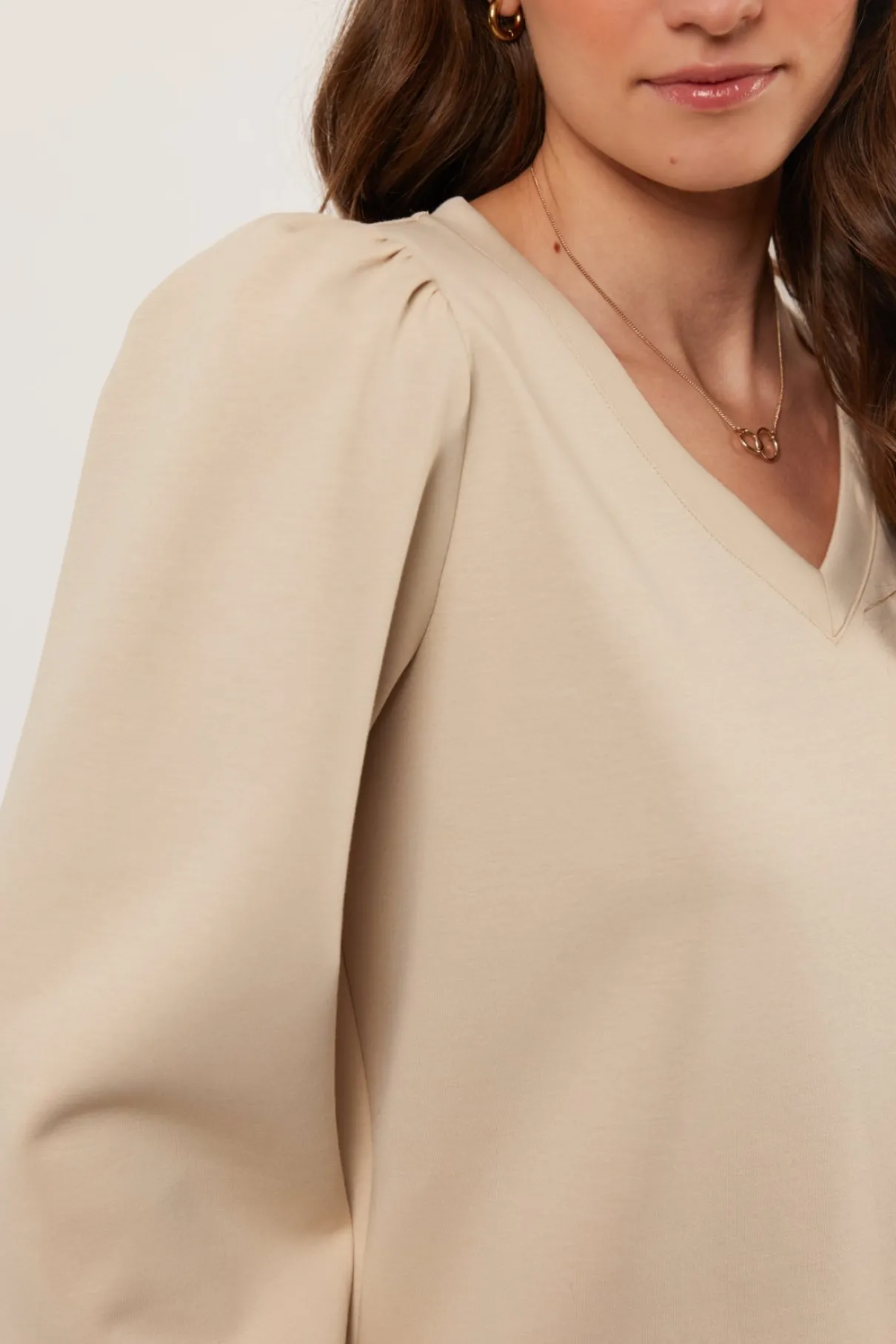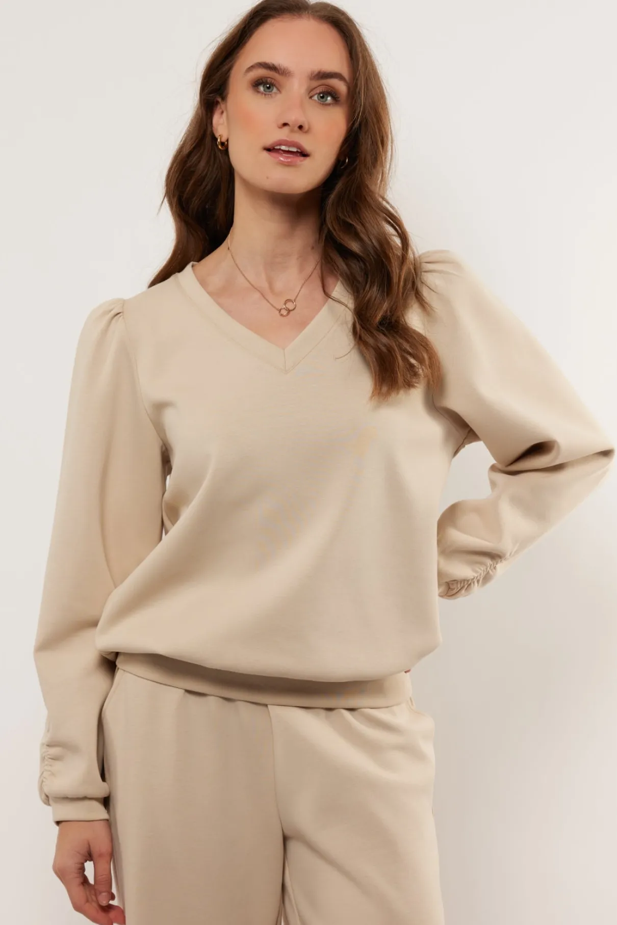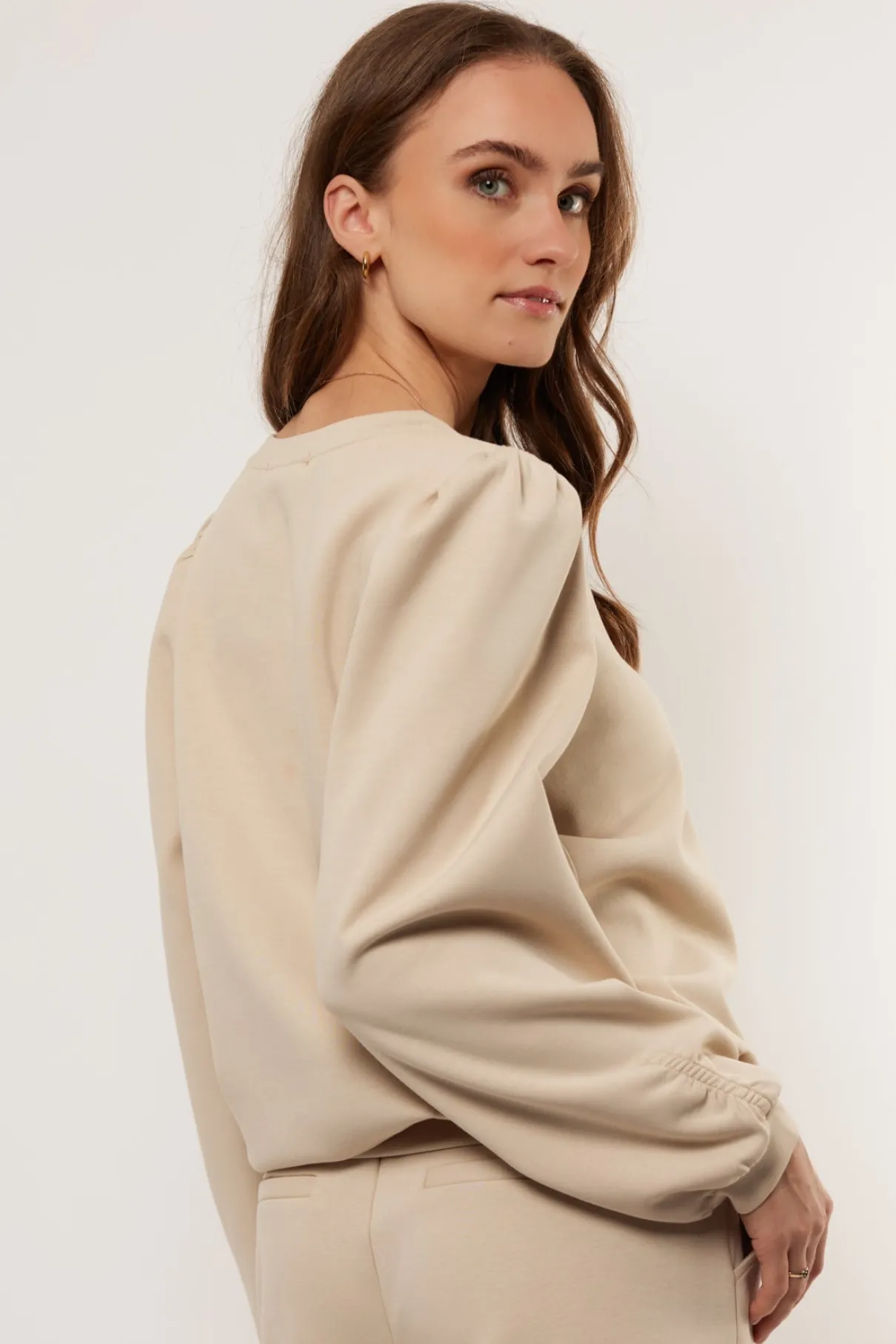 De Lilia sweater is de perfecte combinatie tussen comfy en speels. De sweater heeft een losvallend model met eenv-hals en speelse plooien op de mouwen. Creëer een complete look door deze sweater te stylen met de Milia broek.