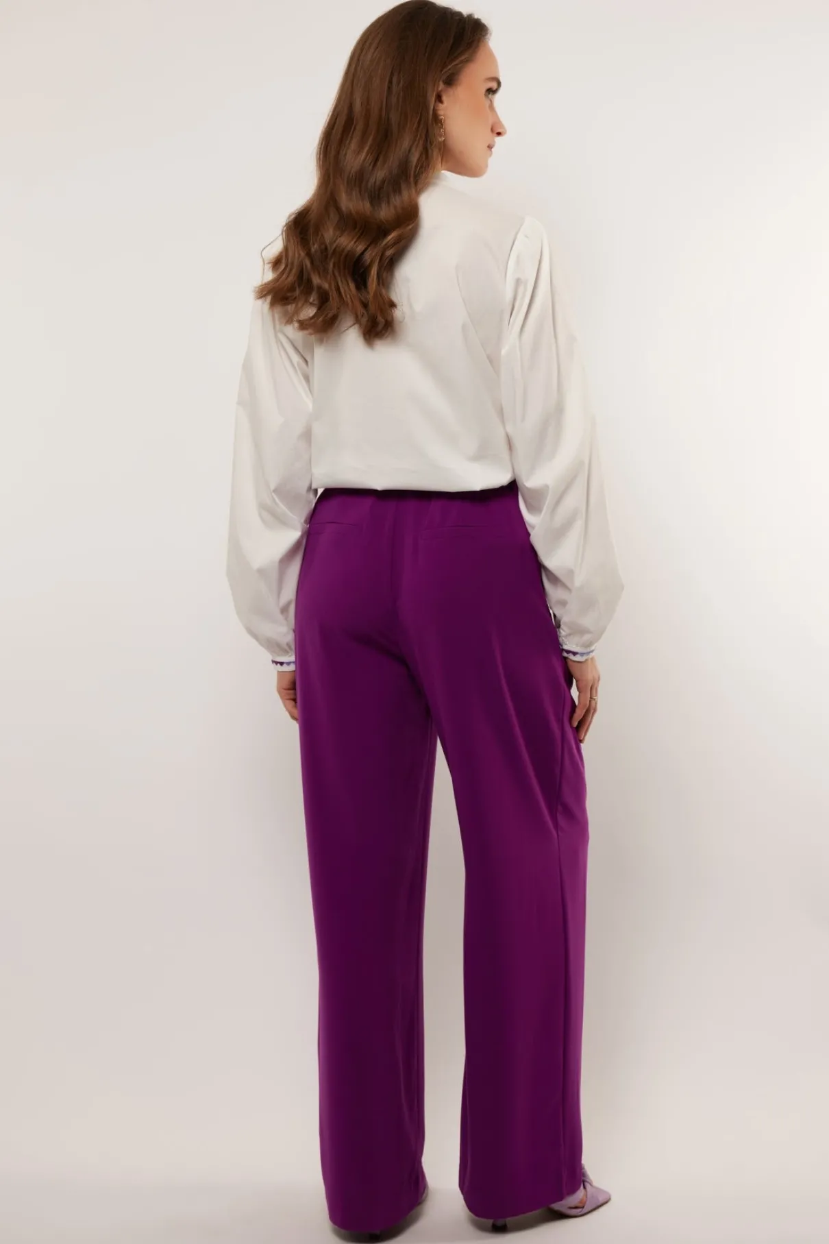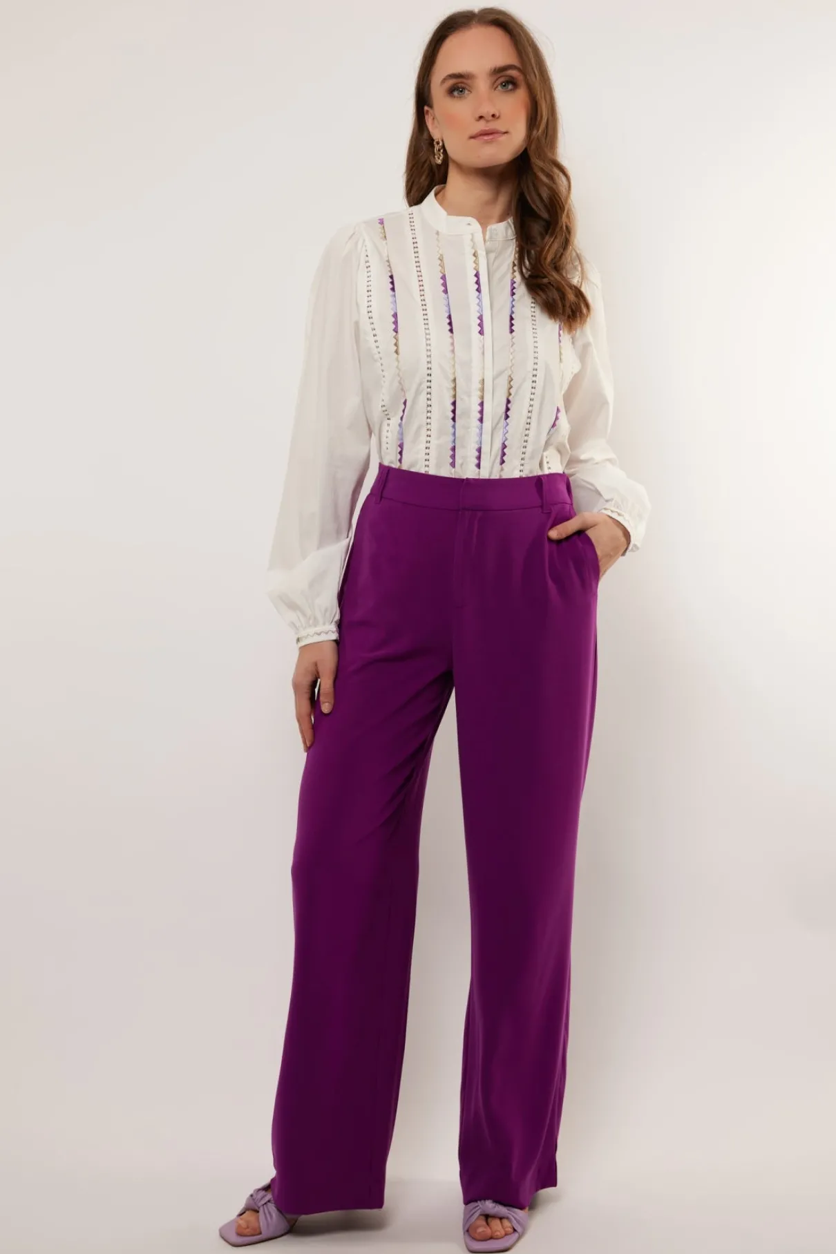 Ga voor een stijlvolle look met de Marije broek. Deze broek heeft een elegante wijde pasvorm met een rits- en knoopsluiting en steekzakken.