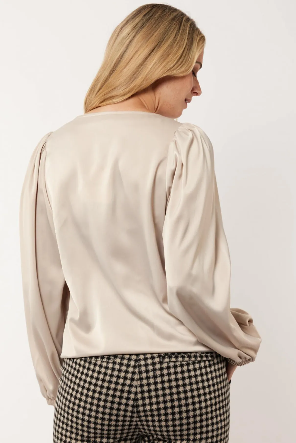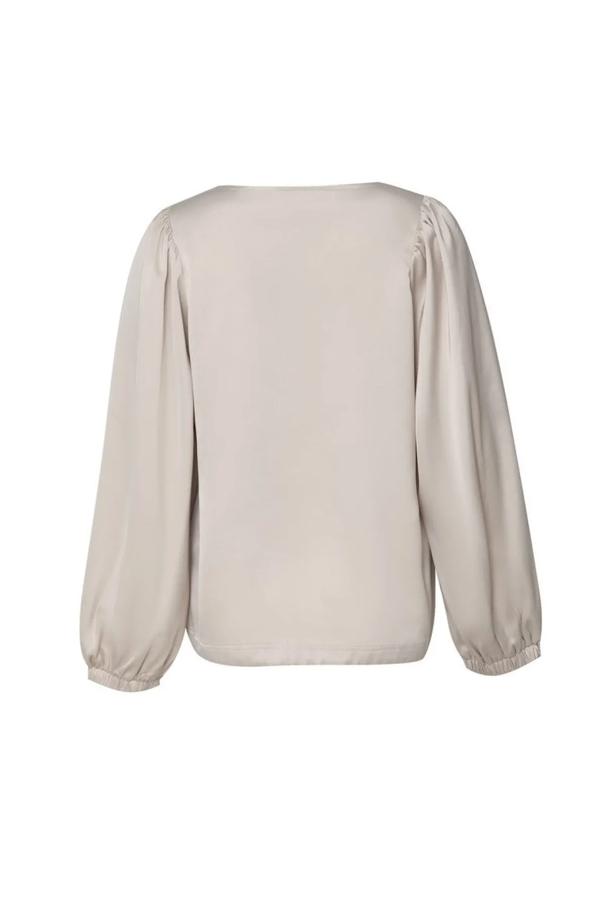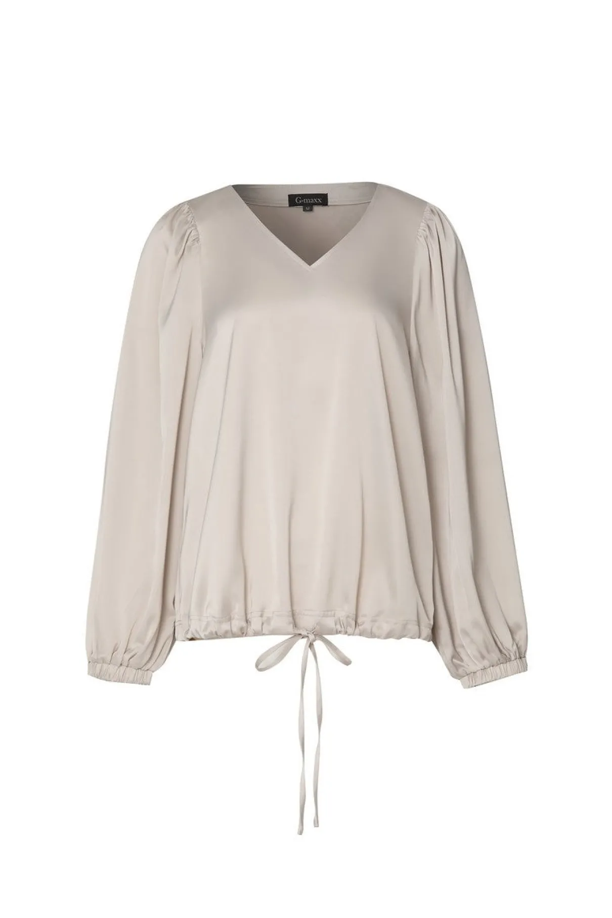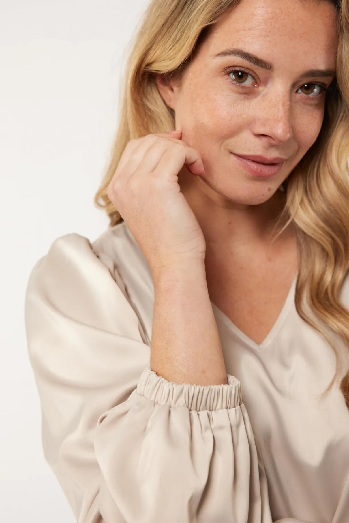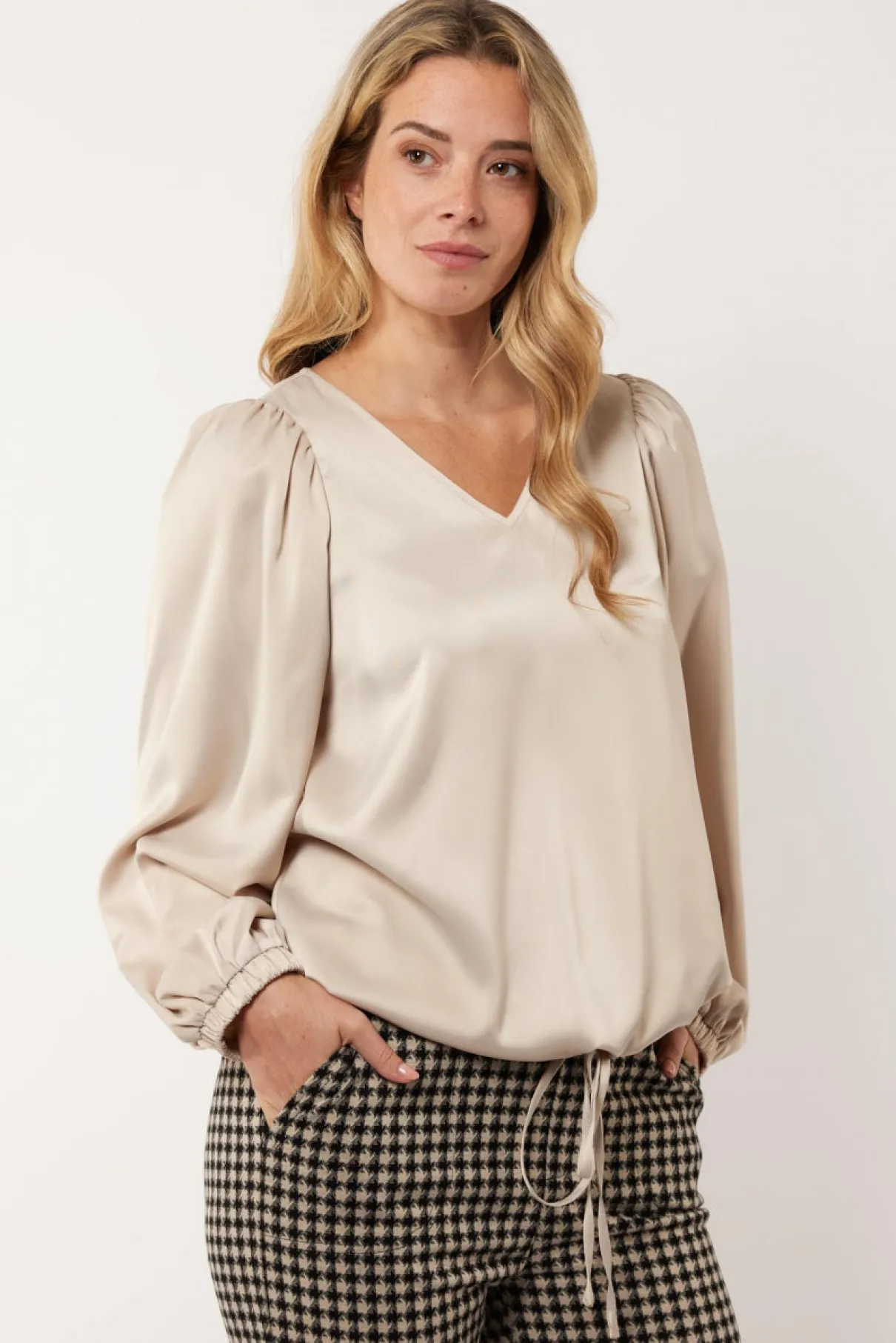 Shine trough winter met de prachtig glanzende Melanie top. Deze top heeft een losvallend model met een V-hals, geplooide mouwen en een tunnelkoord aan de onderkant om de top te laten bloezen. De Melanie top is verkrijgbaar in diverse trendkeuren.