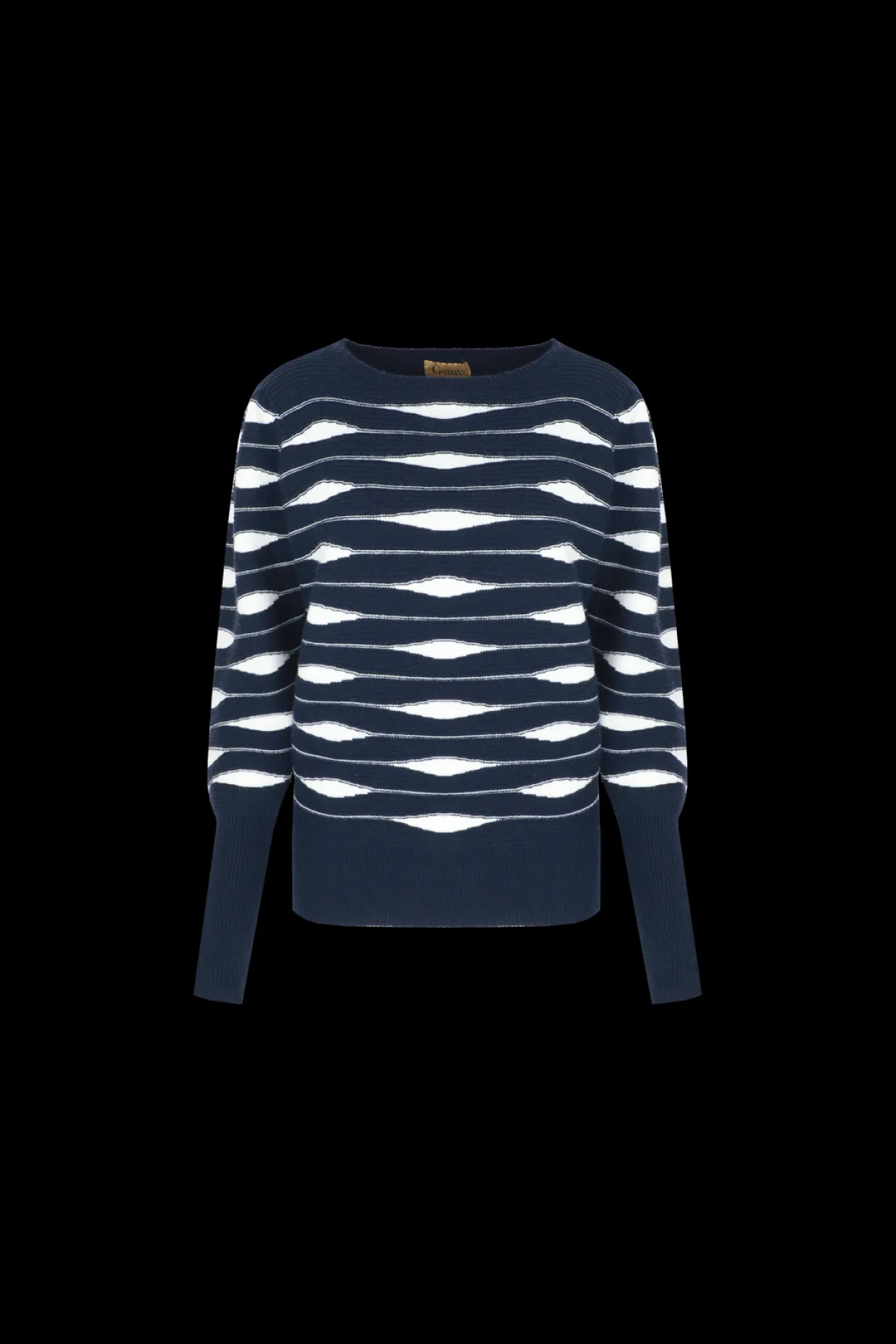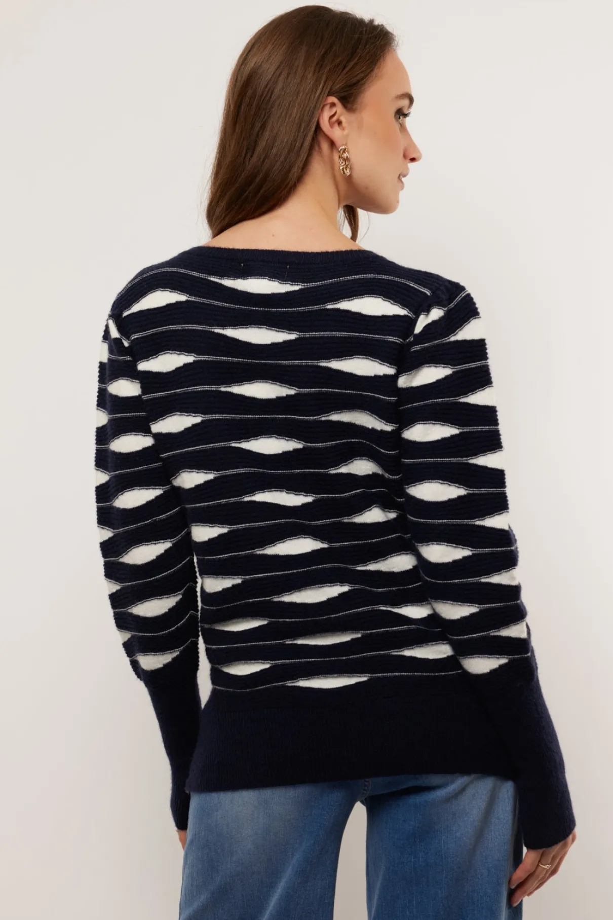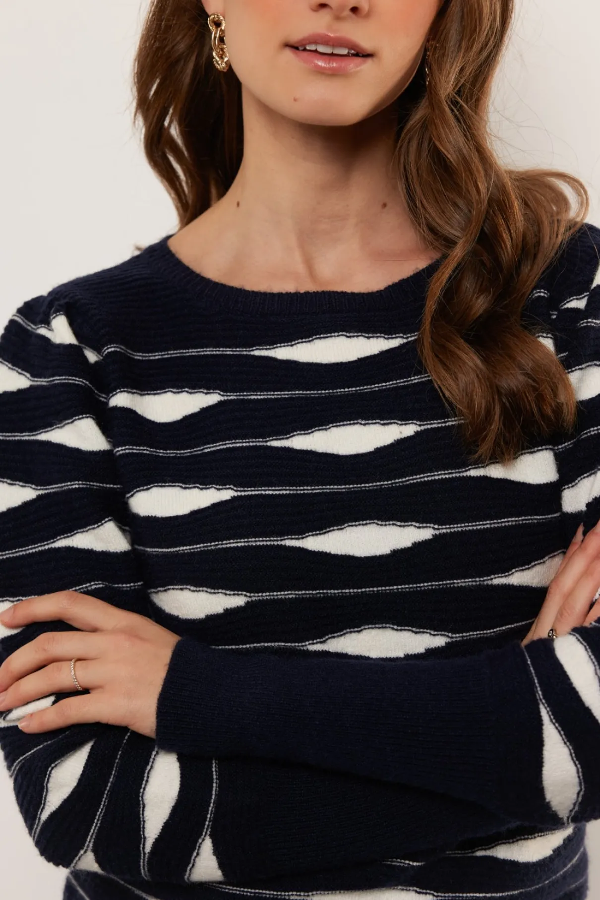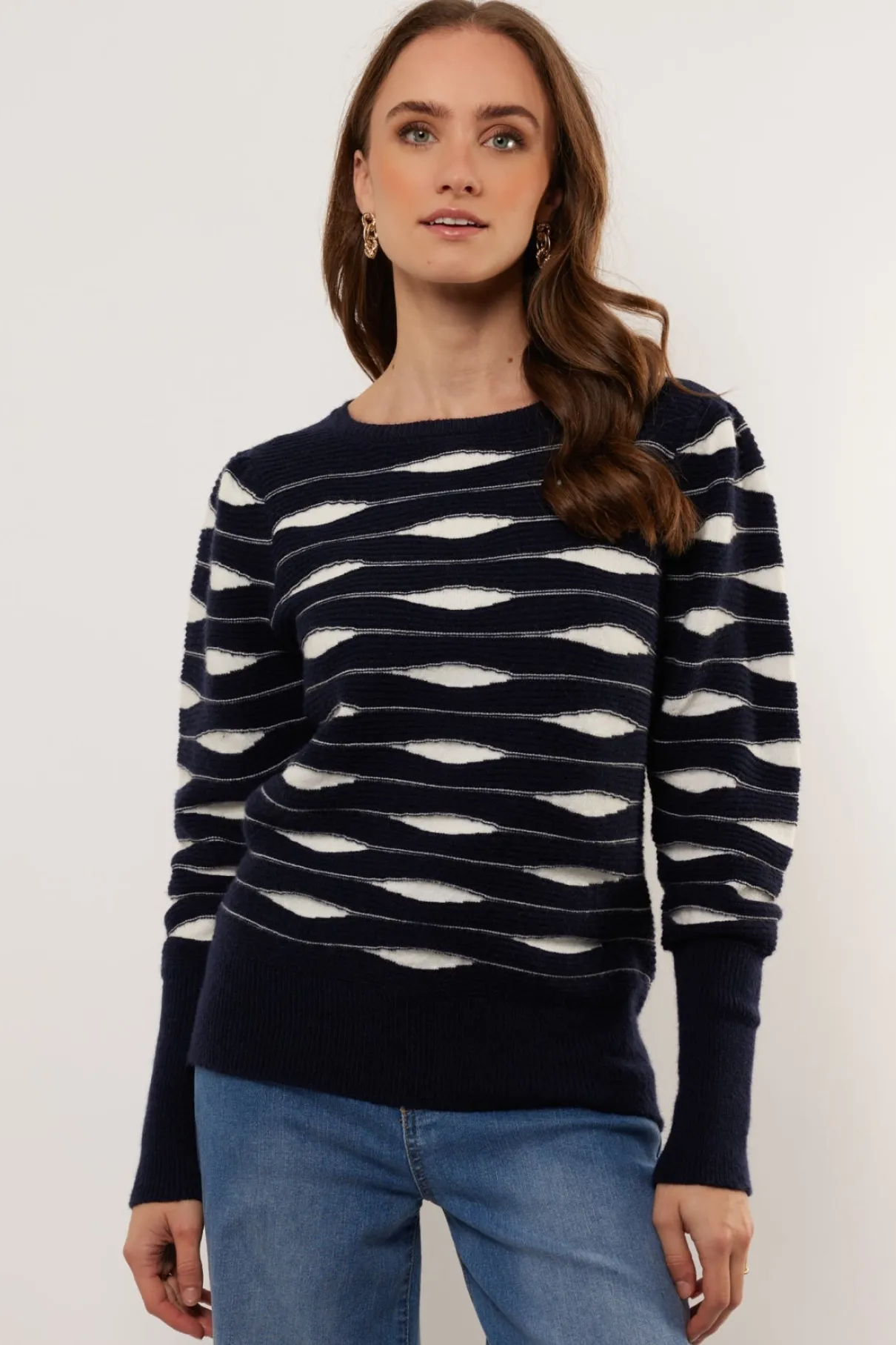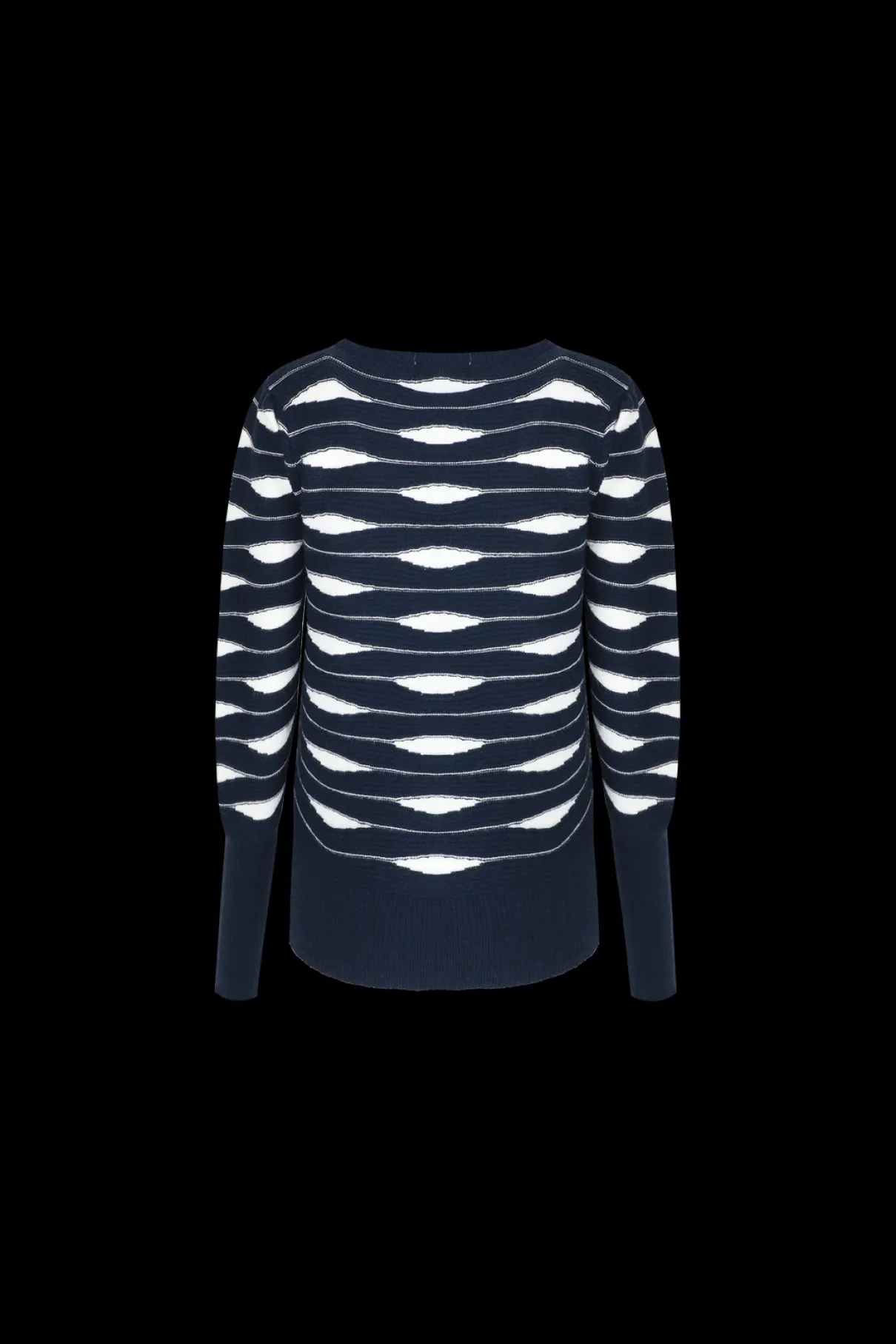 De stijlvolle Mylah trui heeft een modern streeppatroon met uitgesneden details, wat een unieke en speelse uitstraling geeft. De comfortabele pasvorm en lange mouwen maken het een ideale keuze voor zowel casual als chicere gelegenheden.