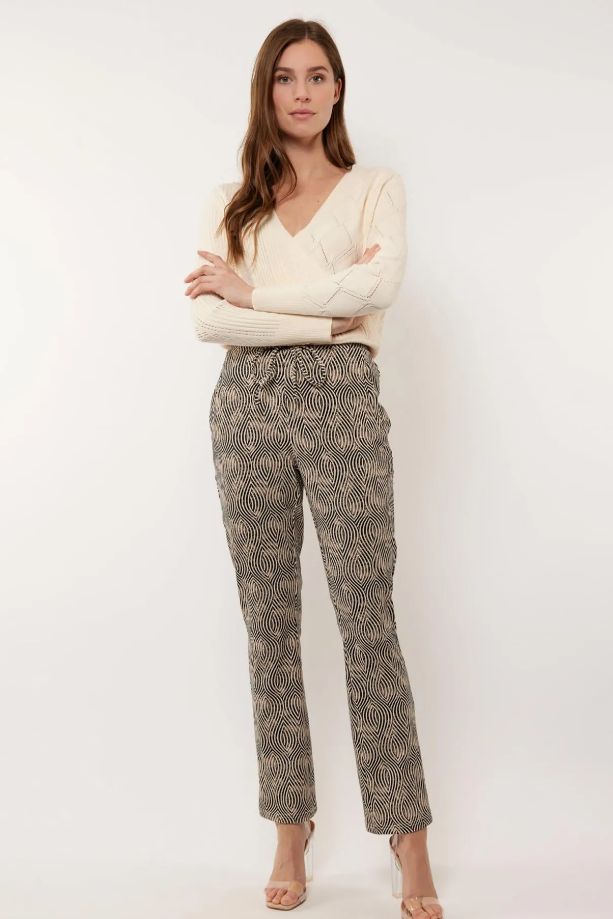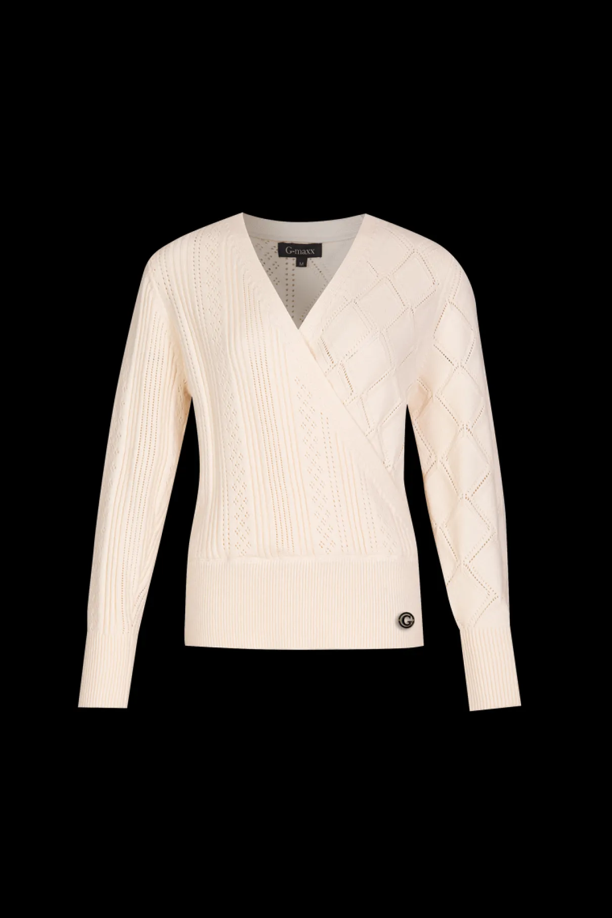 Geef je look een speelse uistraling met de Nerea trui. Deze trui heeft namelijk een omslag model en is voorzien van twee verschillende, gebreide motieven.