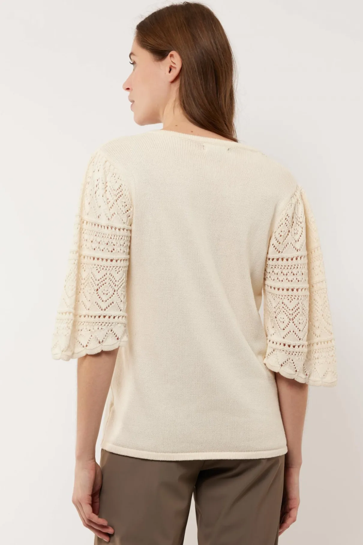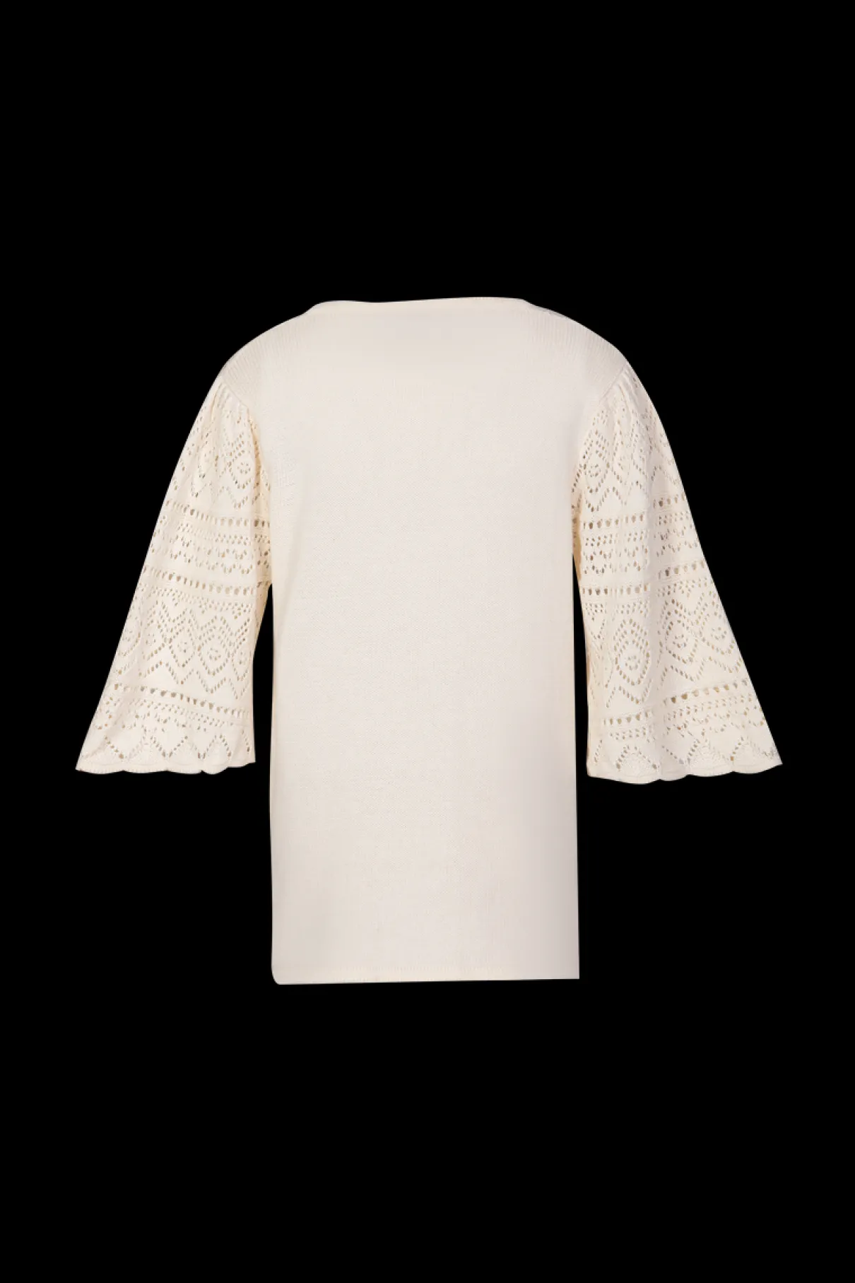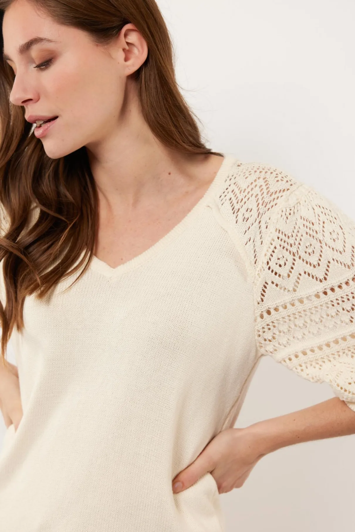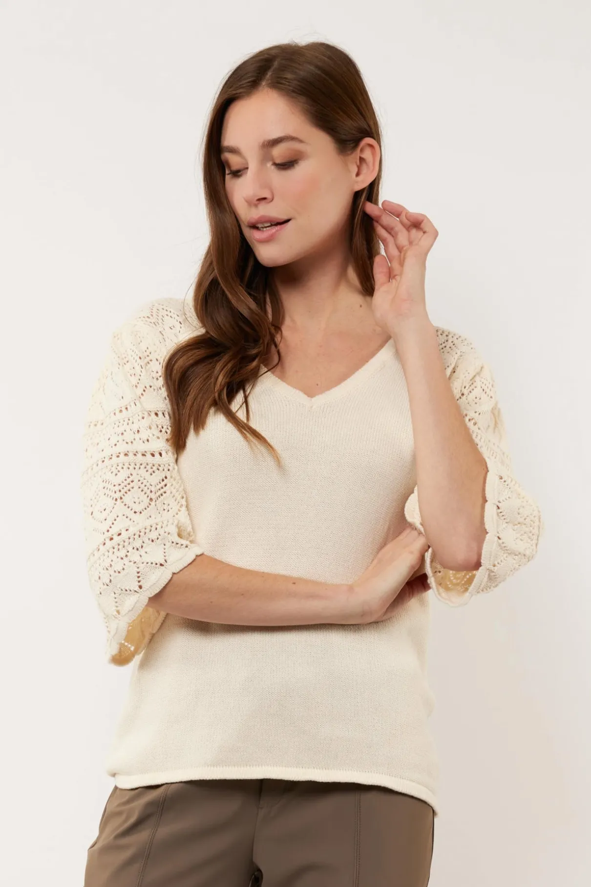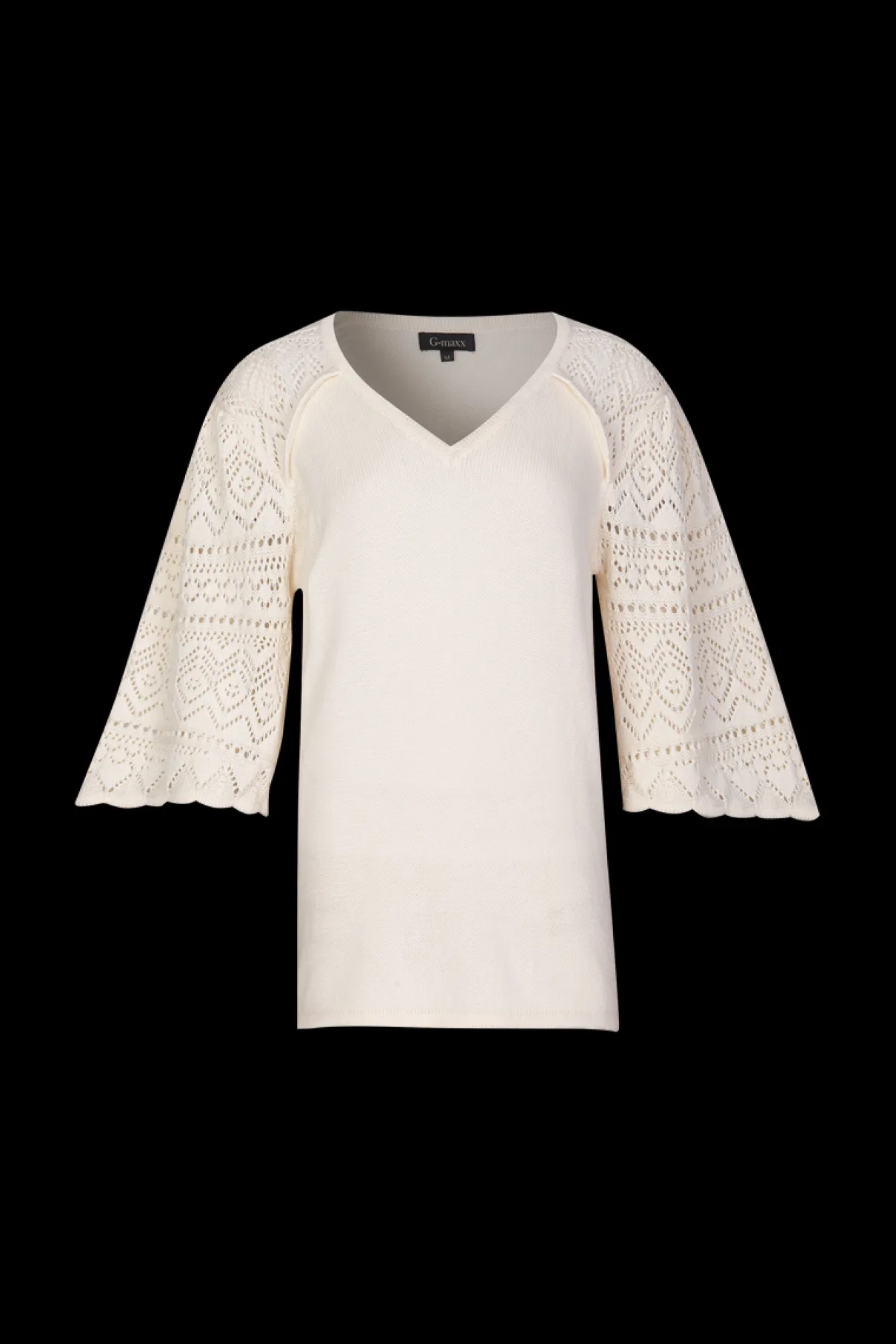 Geef je look een speelse touch met de openwerkte mouwen van de Banu trui. Deze trui heeft een recht model met een mooie V-hals en is verkrijgbaar in meerdere kleuren.
