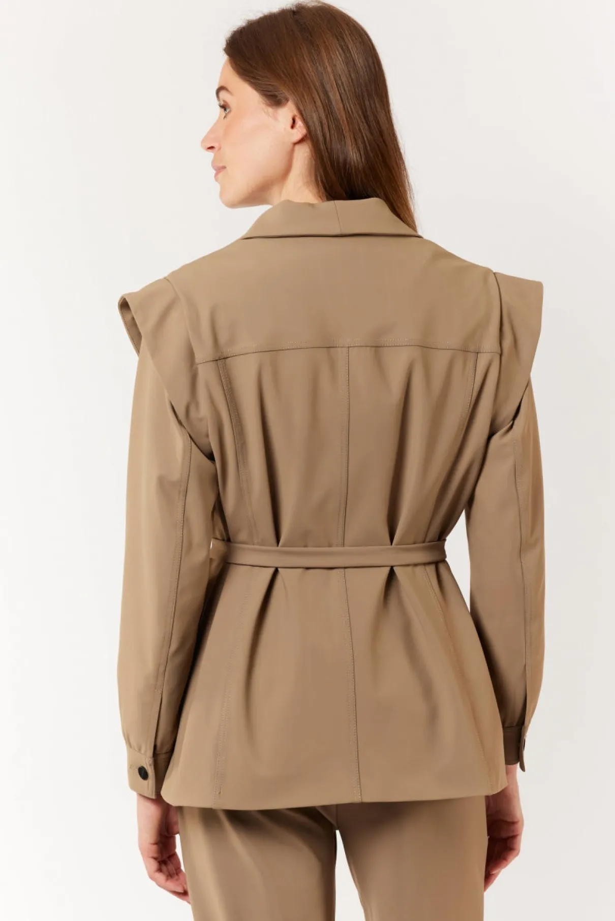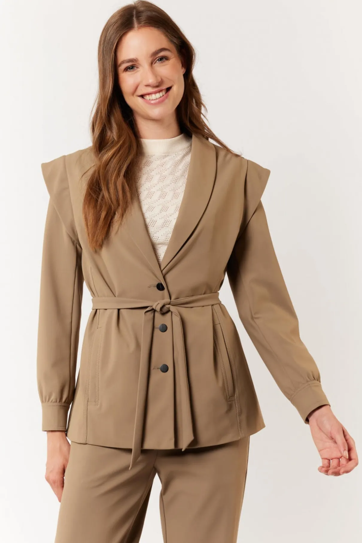 Het Beliany jacket komt super van pas dit najaar. Dit jacket is namelijk multifunctioneel dat je kunt omtoveren tot een mouwloos gilet met een knoopsluiting en een strikceintuur. Dit jacket/gilet kun je als complete set stylen met de bijpassende Laurena broek.