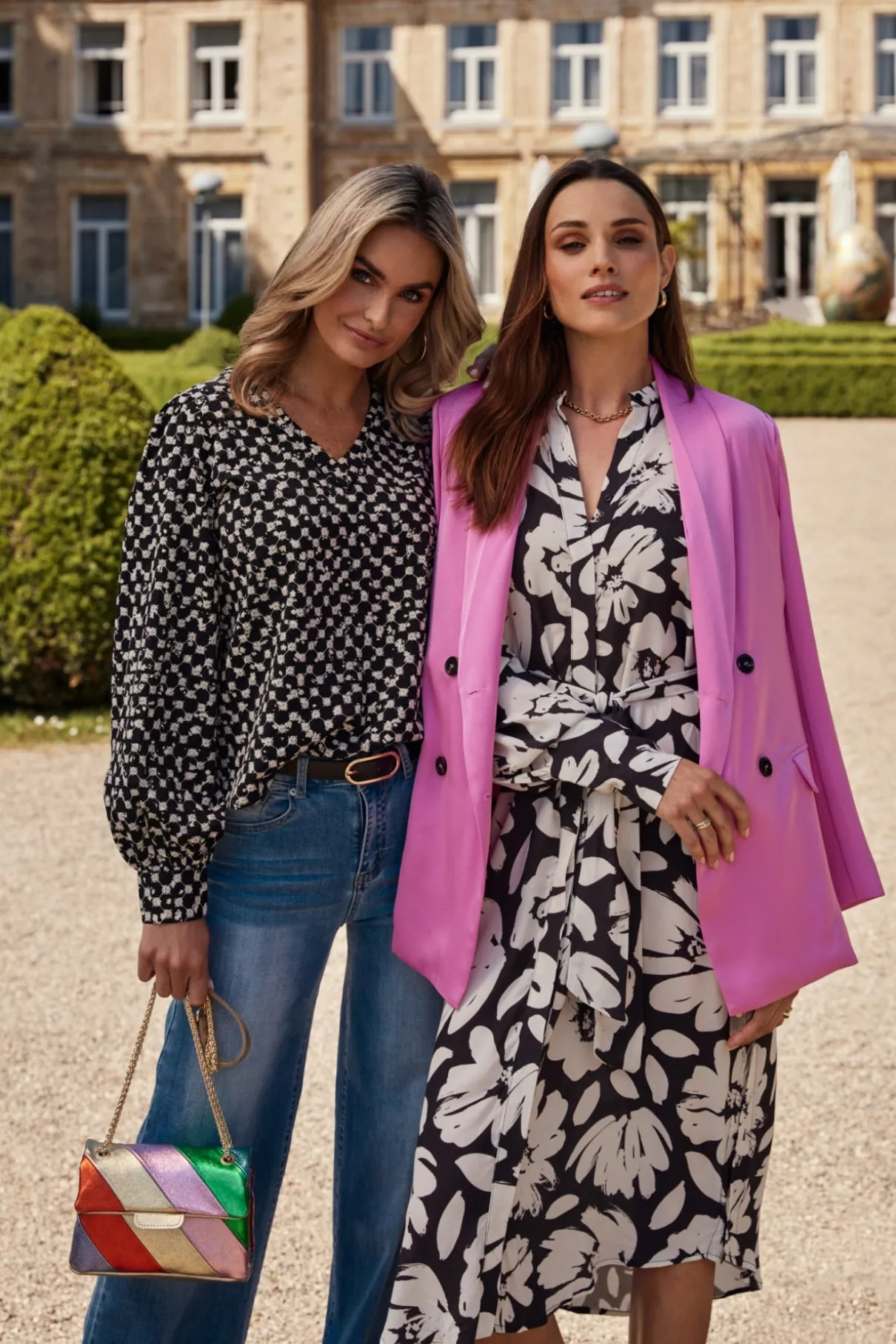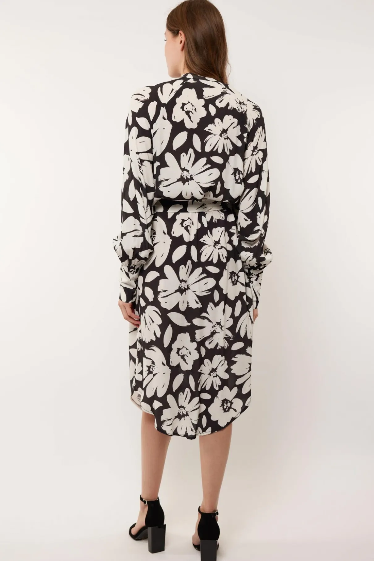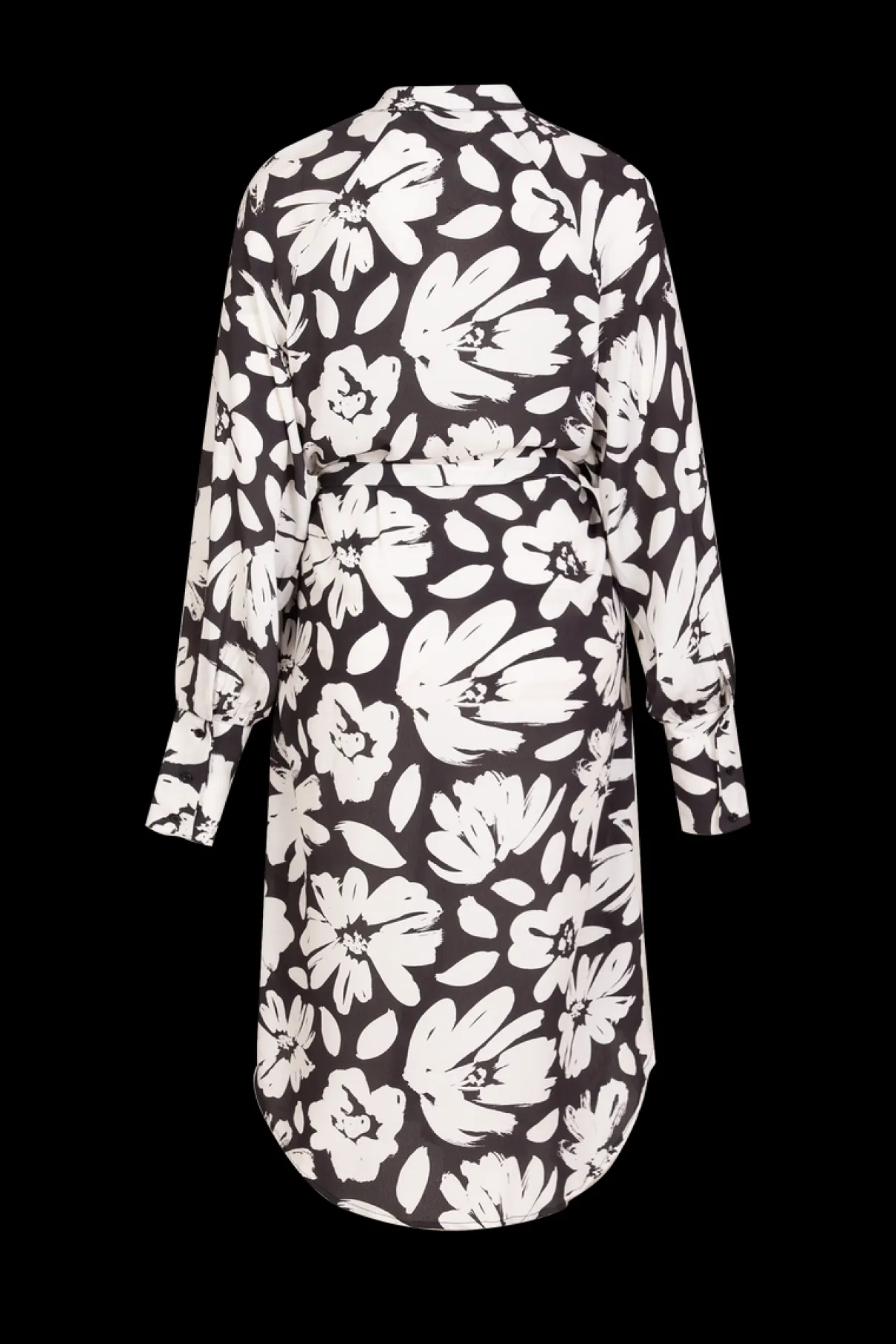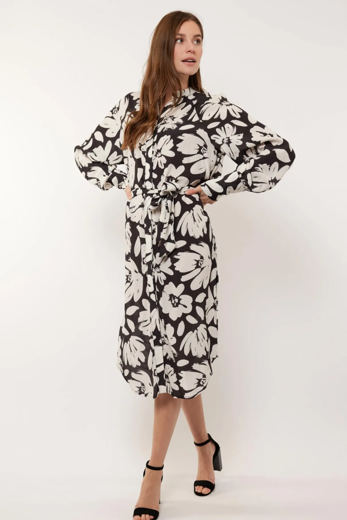 Ga voor een klassieke bloemenlook met de Bertine jurk. Deze jurk heeft een halflang model met een korte kraag, een knoopsluiting en een strikceintuur rond de taille.