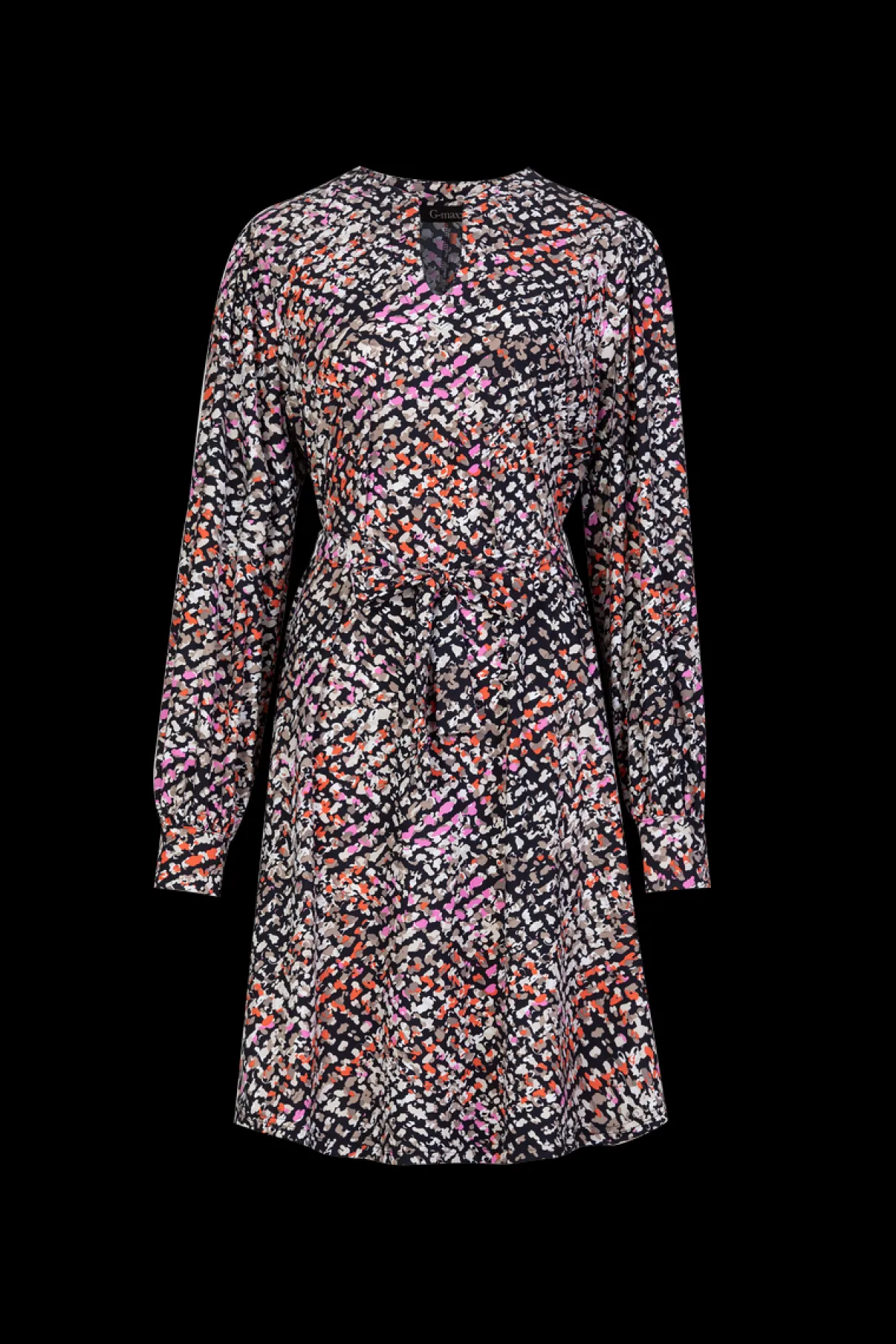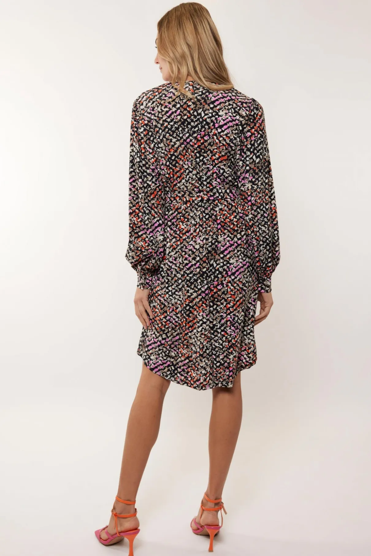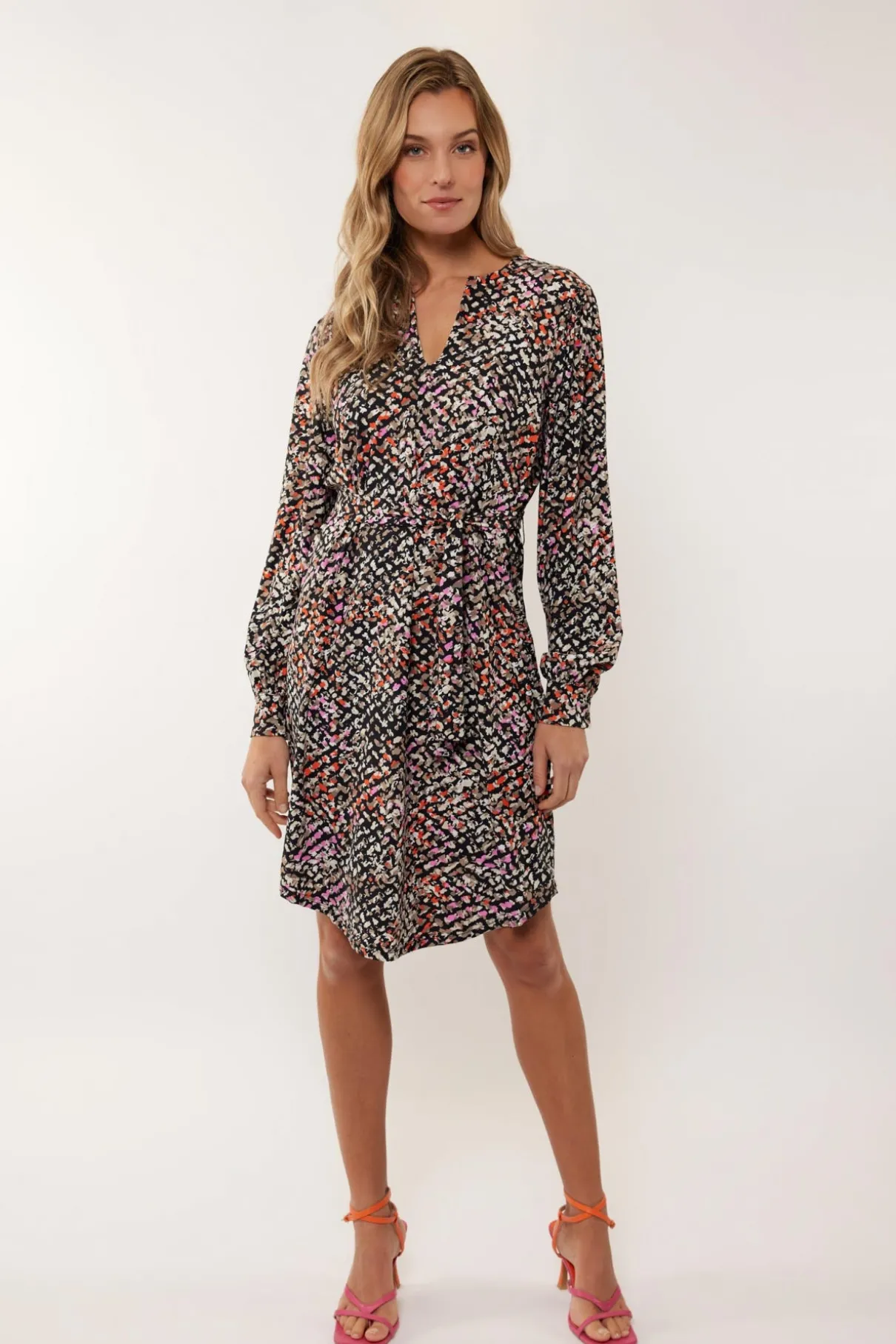 Geef je voorjaarslook een speelse touch met de abstracte print van de Bibi jurk. Deze jurk heeft een A-lijn model tot de knie, met een open hals en een strikceintuur ronde taille.