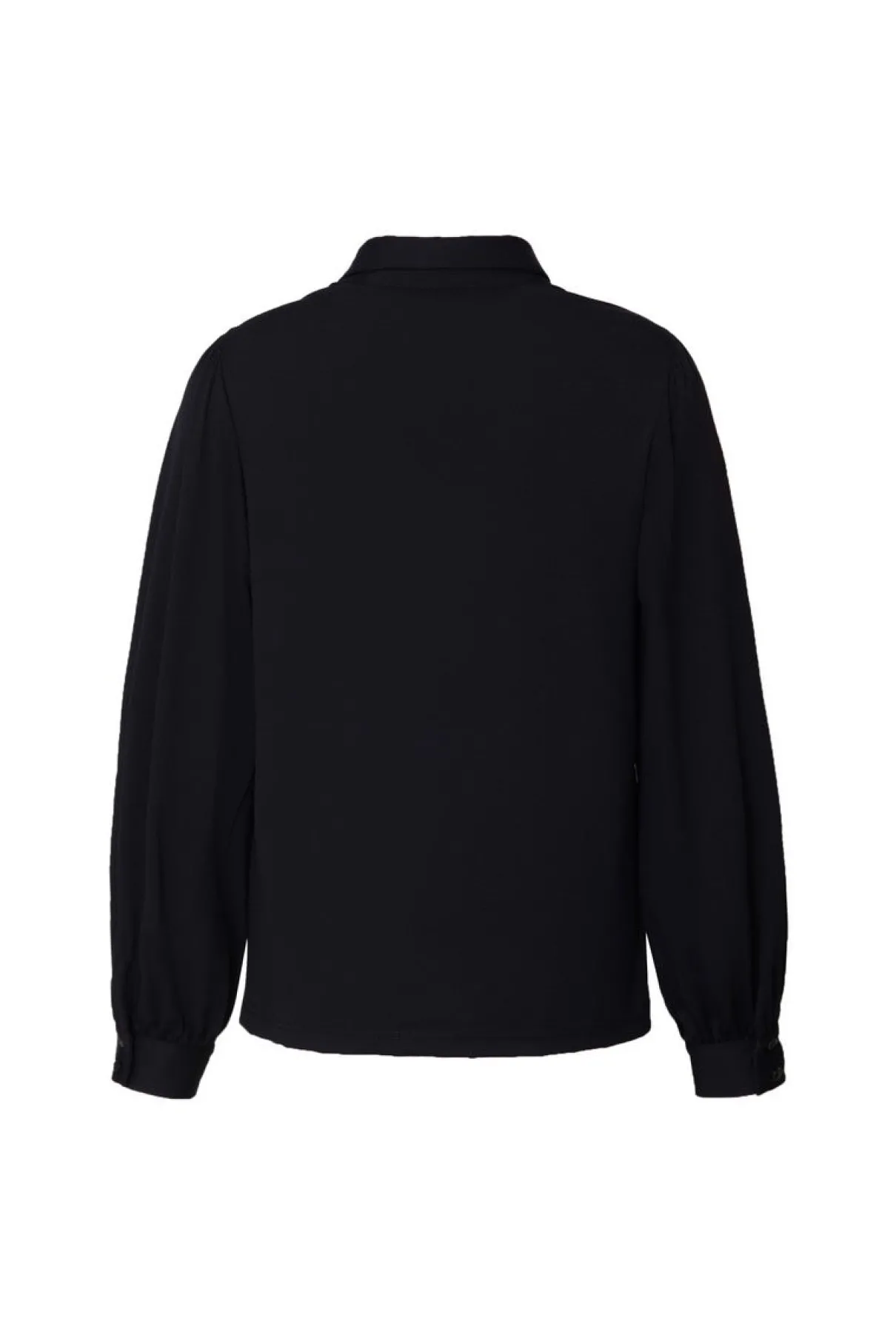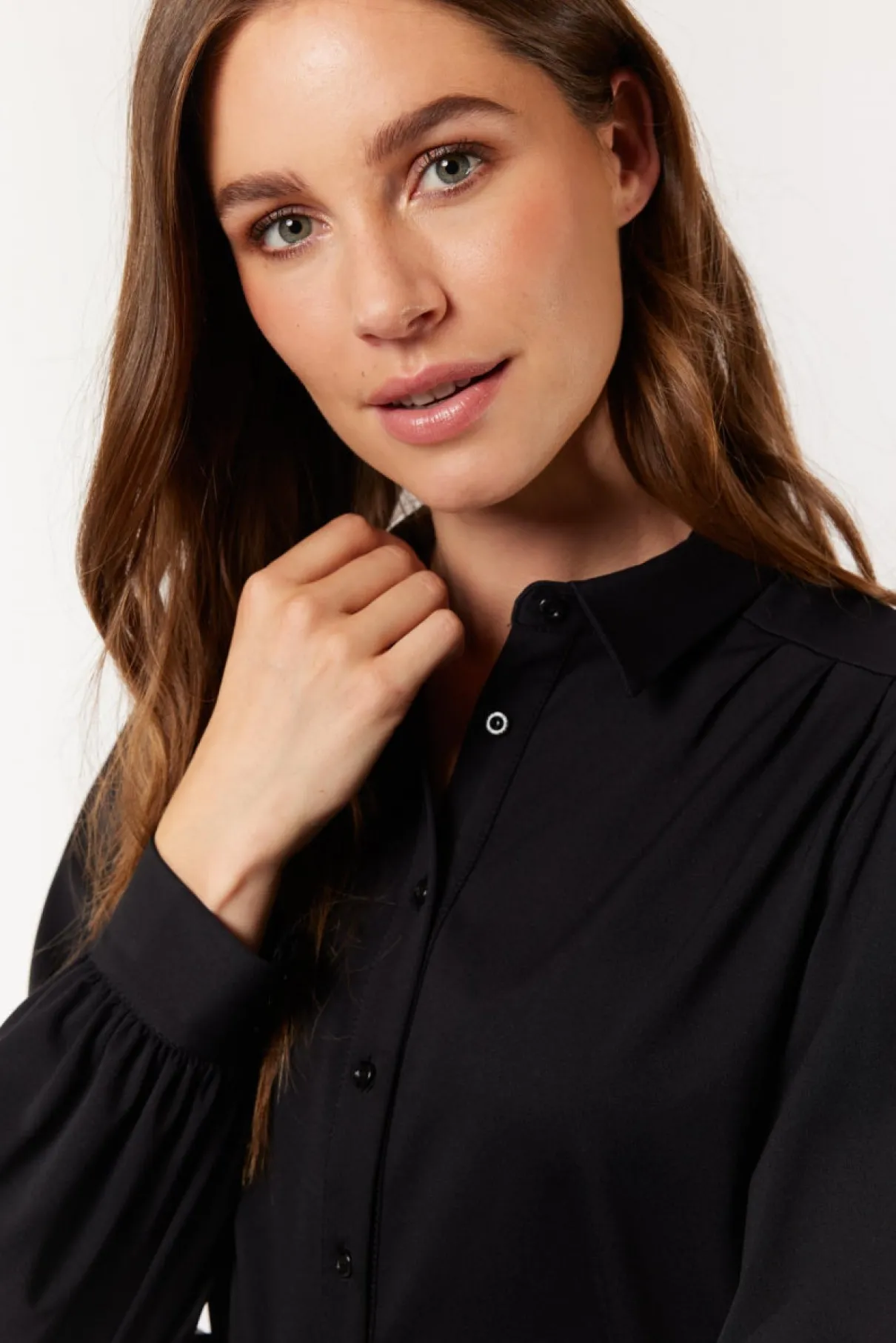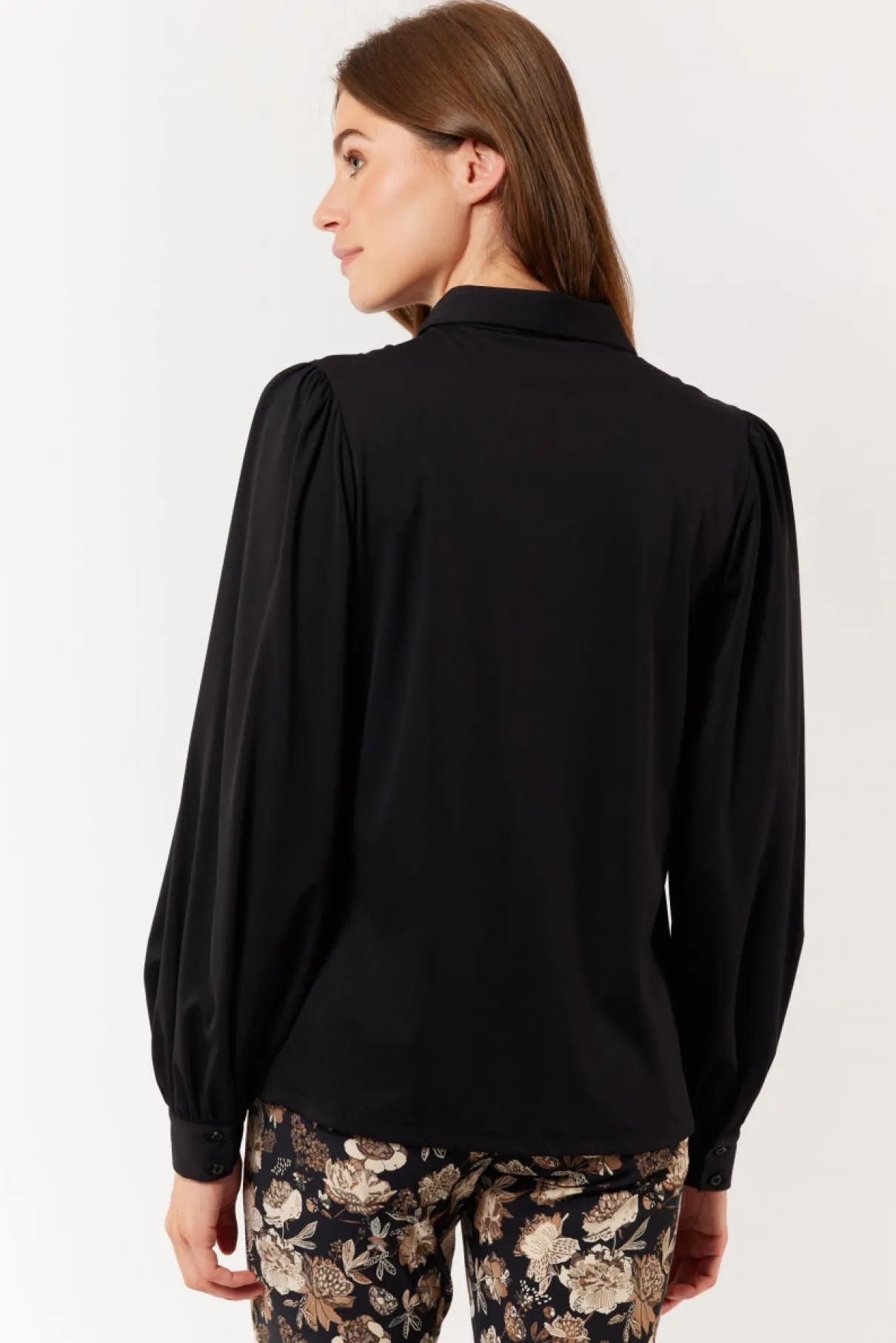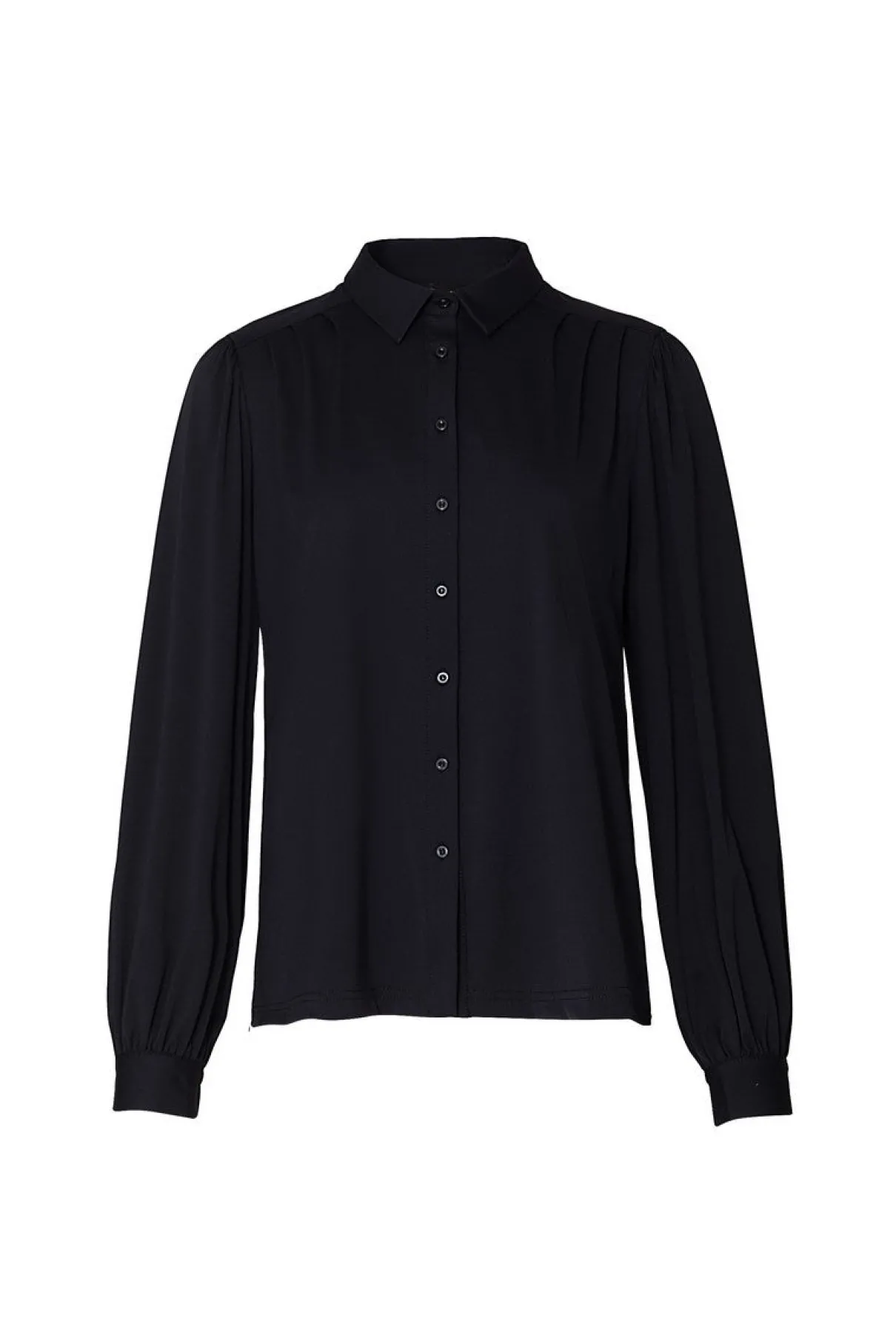Dit najaar is de collectie aangevuld met een nieuw soort stof: Yoga Fabric, dat super comfortabel op de huid ligt. De Bibiana blouse is gemaakt van deze stof en heeft een recht model met een klassieke kraag en een knoopsluiting.