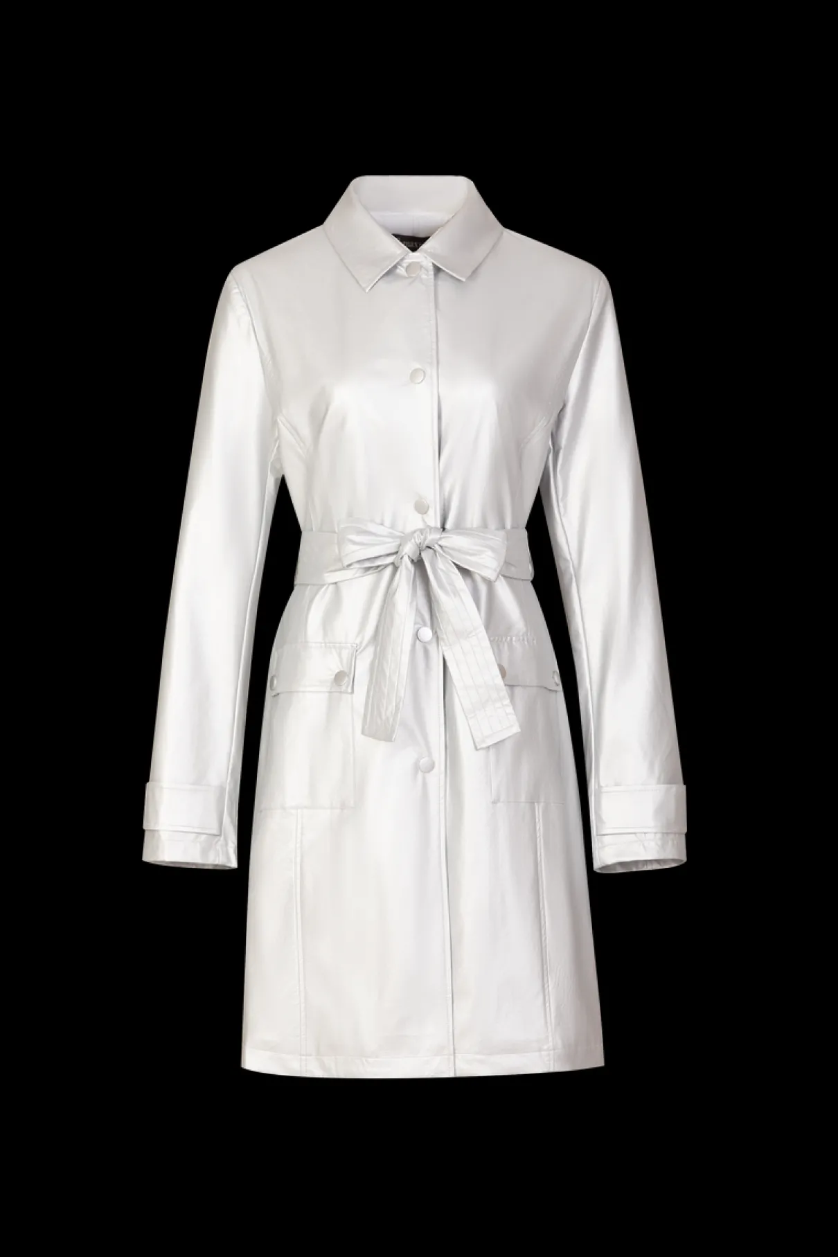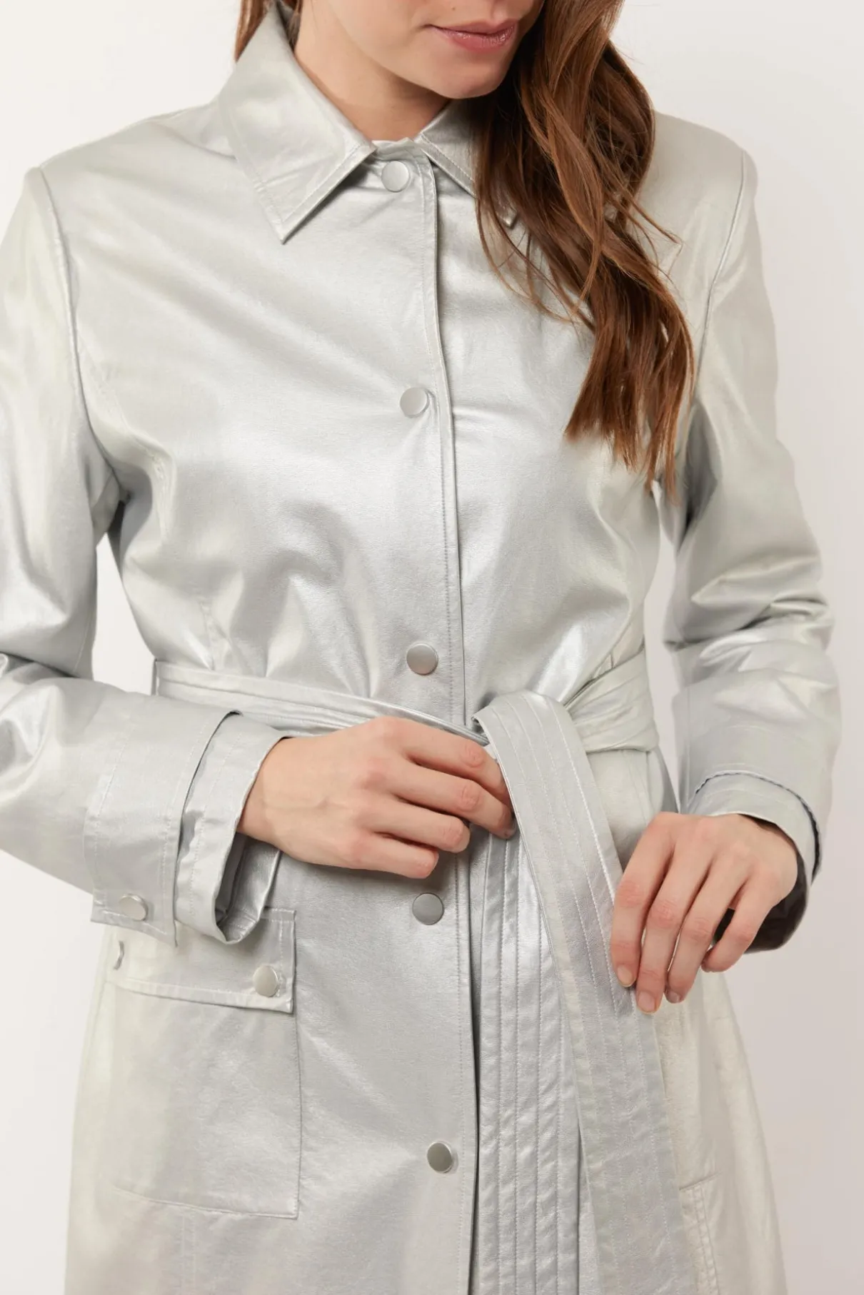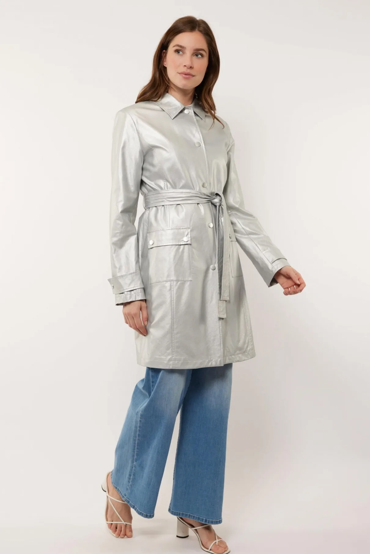 De Birgit jas is de perfecte tussenjas door het klassieke model en de faux-leather look. De jas valt tot de knie en is voorzien van een kraag, een drukknoopsluiting, klepzakken en een strikceintuur rond de taille.