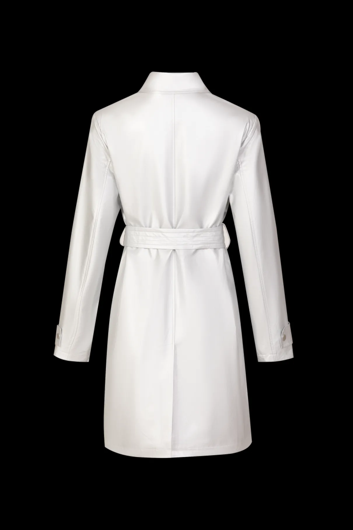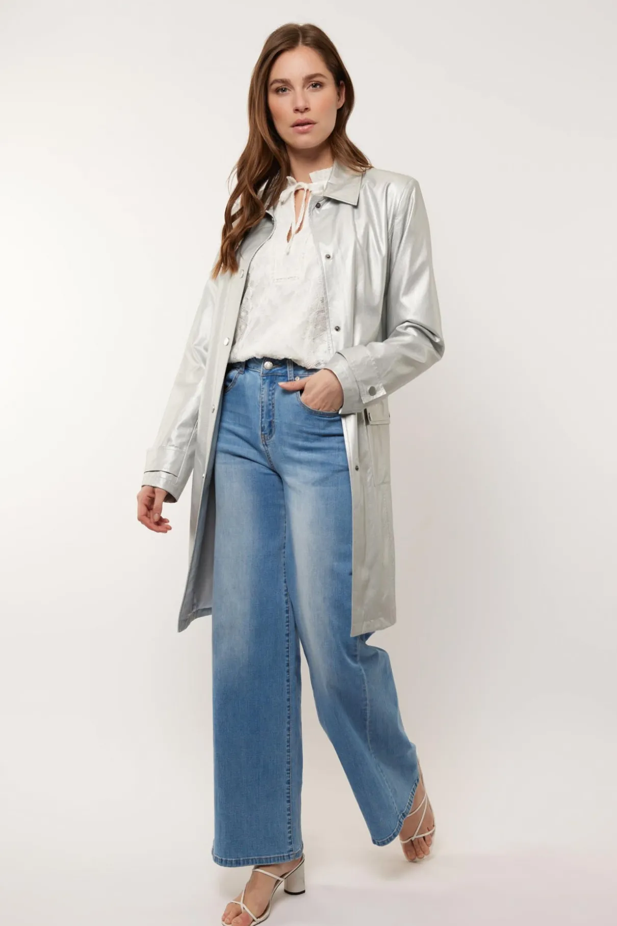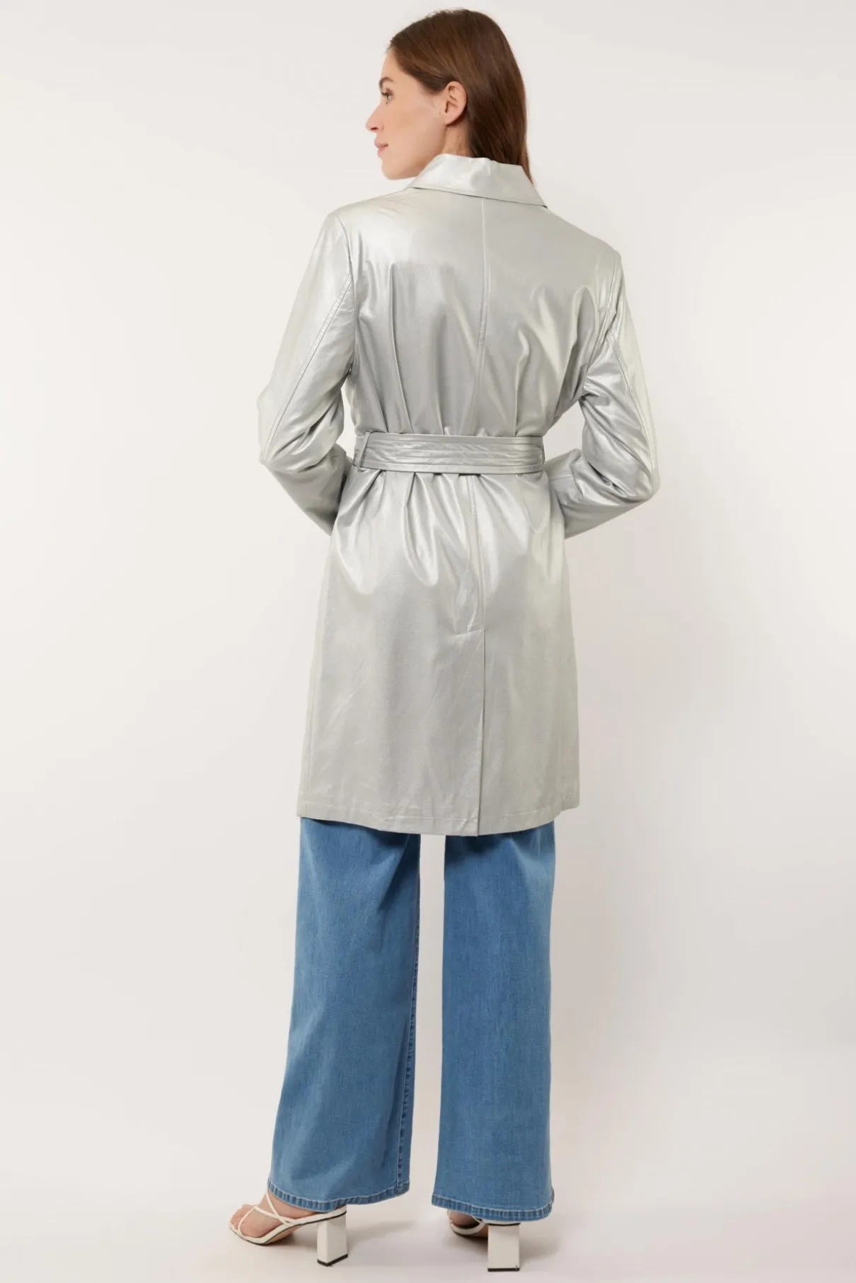 De Birgit jas is de perfecte tussenjas door het klassieke model en de faux-leather look. De jas valt tot de knie en is voorzien van een kraag, een drukknoopsluiting, klepzakken en een strikceintuur rond de taille.