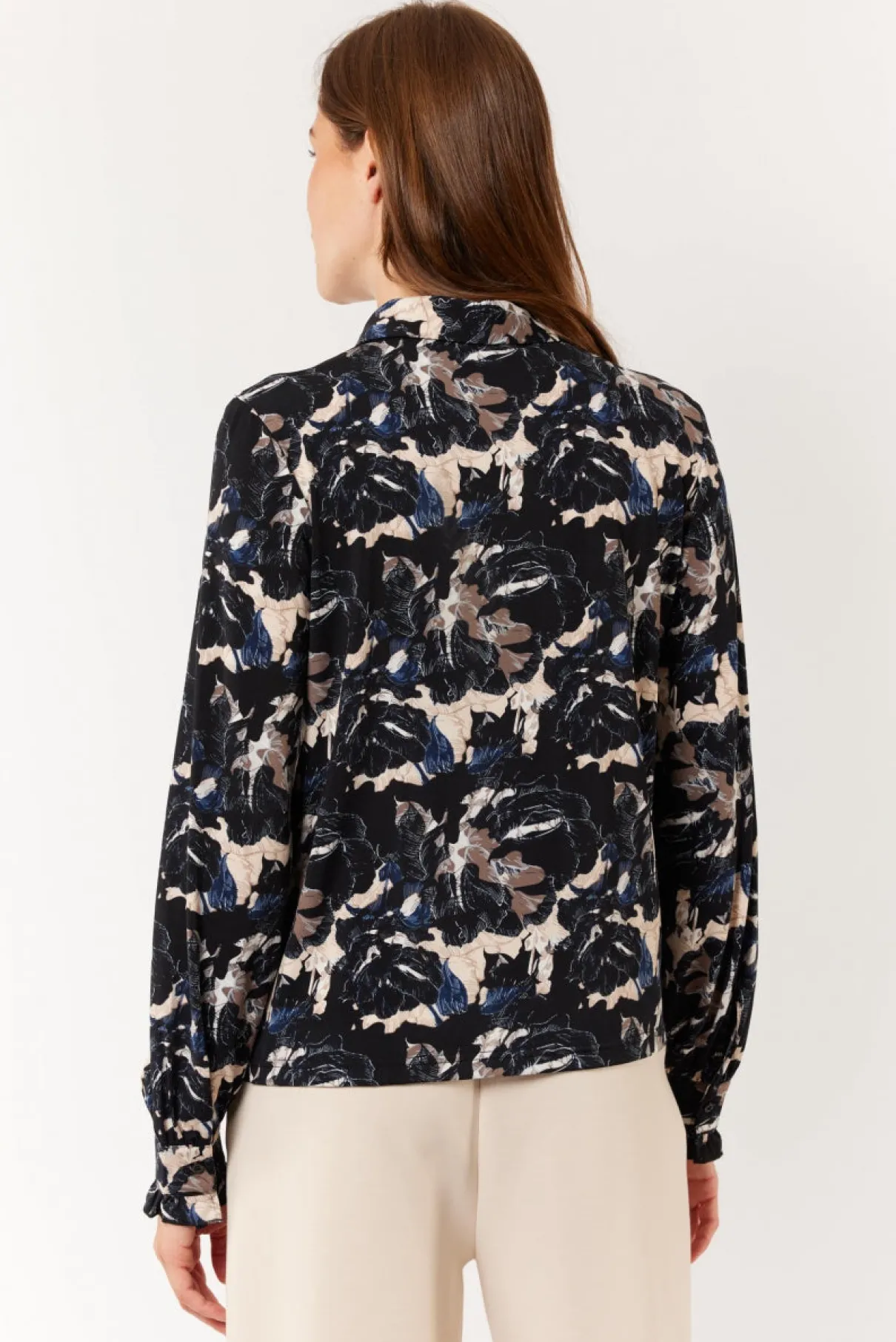 Marineblauw is één van de favoriete accentkleuren van dit najaar. Zo ook terug te vinden in het dessin van de Bobbi blouse. Deze blouse heeft een recht model met een knoopsluiting, een klassieke kraag en ruffles langs de voorzijde.