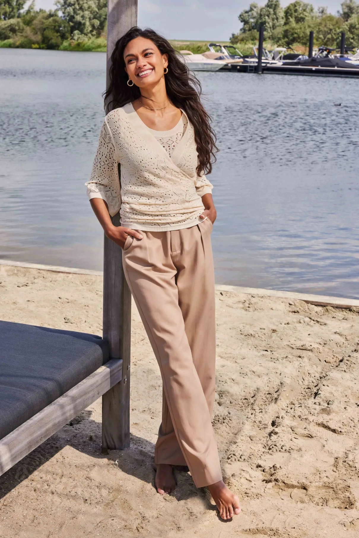 Ga deze zomer op chic met de witte Chelsey broek. Deze broek heeft een elegante wide-leg model en is voorzien van steekzakken, riemlussen en een haak- en knoopsluiting. Maak je look af door deze broek met de Zammi blazer te stylen.
