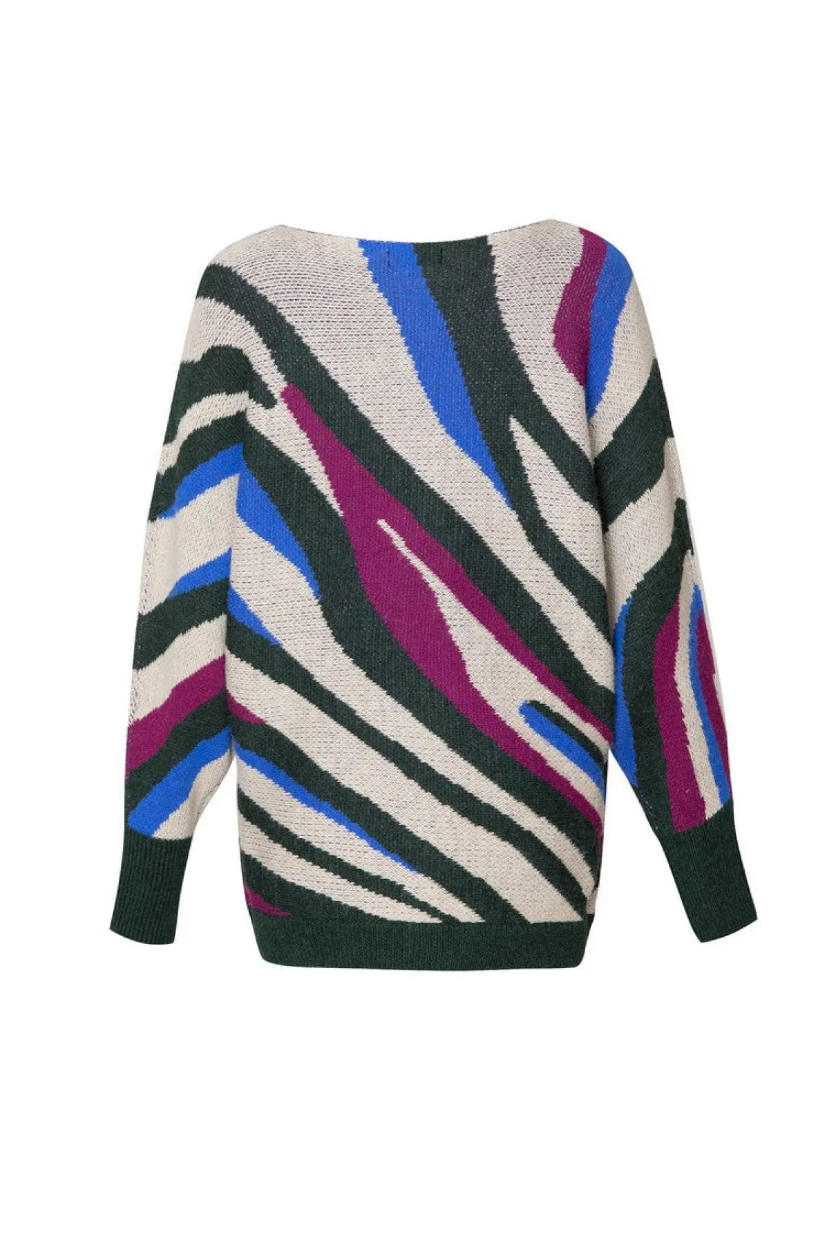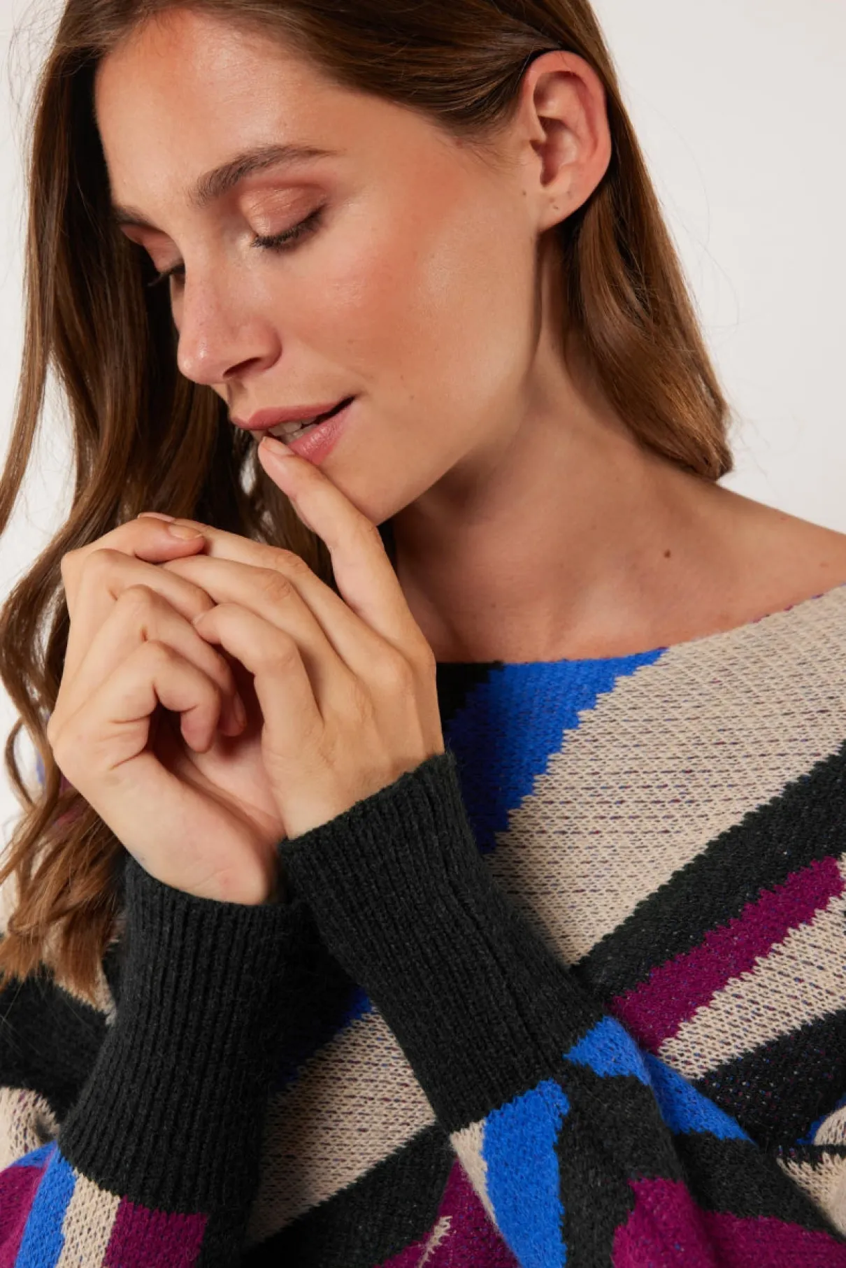 Eén van Froukje’s favorieten van deze winter is de kleurrijke Dalia trui. Deze fijne trui heeft een herkenbaar en terugkerend model met een mooie boothals. De gebreide trui heeft een speels lijnenspel met de trendkleuren van dit seizoen.
