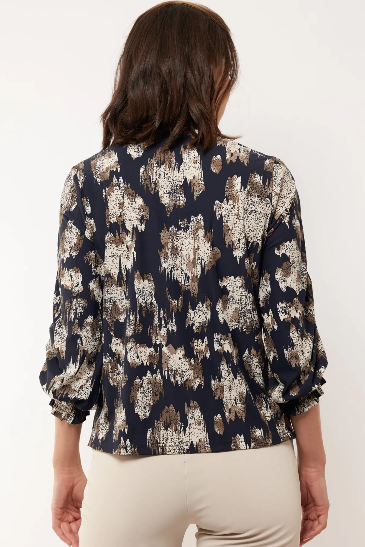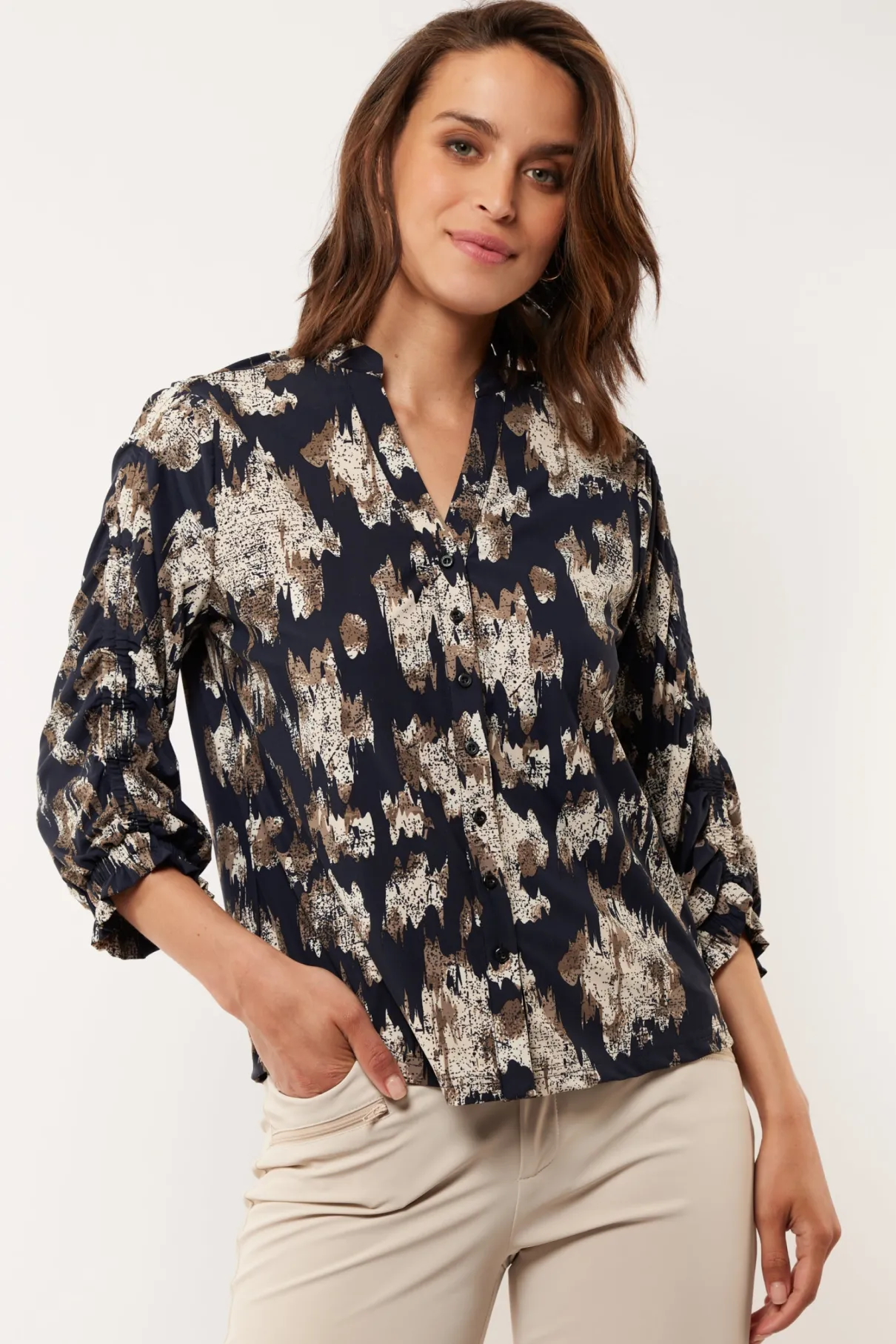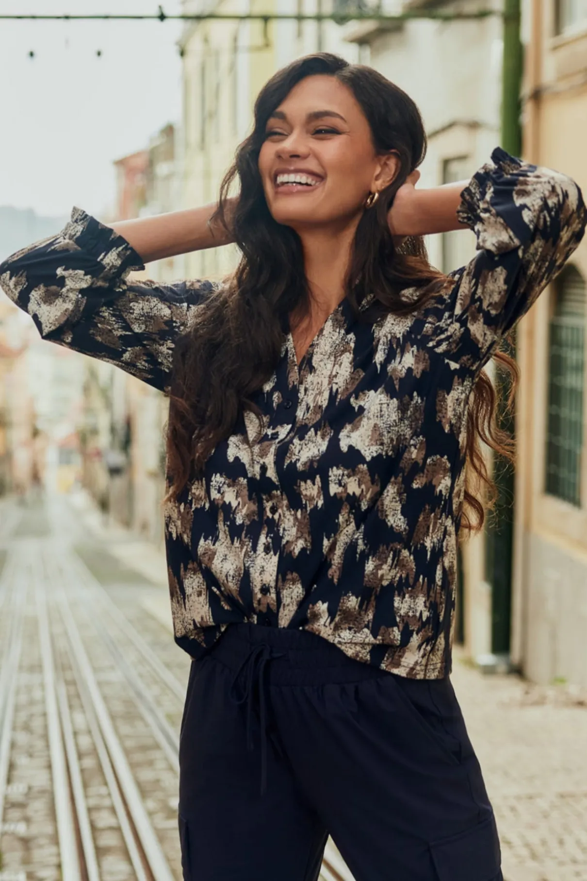 De Eef top is gemaakt van travelstof en biedt daardoor een hoog draagcomfort, ideaal voor de warme zomerdagen.De top heeft een losvallend model met een V-hals en geplooide mouwtjes en is voorzien van een speelse, abstracte print. Style deze top met de welbekende Eve broek voor een complete set.