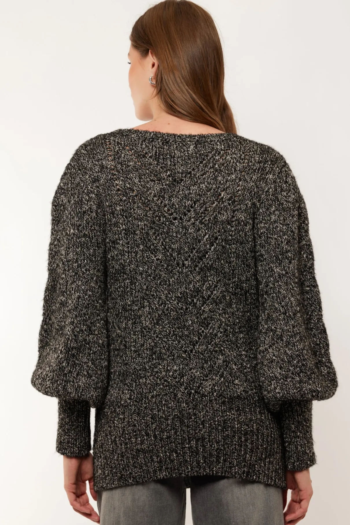 Ontdek de Elisse trui, een perfecte mix van comfort en stijl. De trui heeft een subtiel, geometrisch breipatroon aan de voorkant, wat zorgt voor een stijlvolle uitstraling. De mouwen zijn wijd en de boorden zijn ribgebreid, wat bijdraagt aan een comfortabele en warme pasvorm.