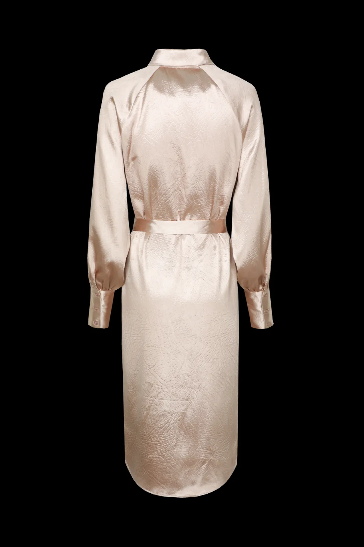 Ga deze winter voor comfortabel chic met de Kathy jurk. De jurk heeft een klassiek A-lijn model met elegante satijnen look. De knoopsluiting loopt van boven tot onder, terwijl het strikceintuur de taille accentueert en de hoge boorden bij de mouwen zorgen voor een verfijnde afwerking.