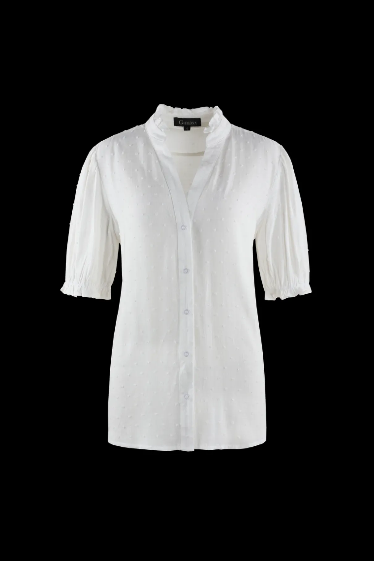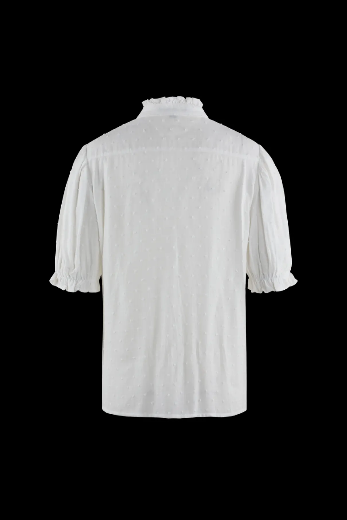 De Linde blouse geeft je voorjaarslook een lieve uitstraling door de ruffles en broderie. De blouse wordt gesloten middels een knoopsluiting.
