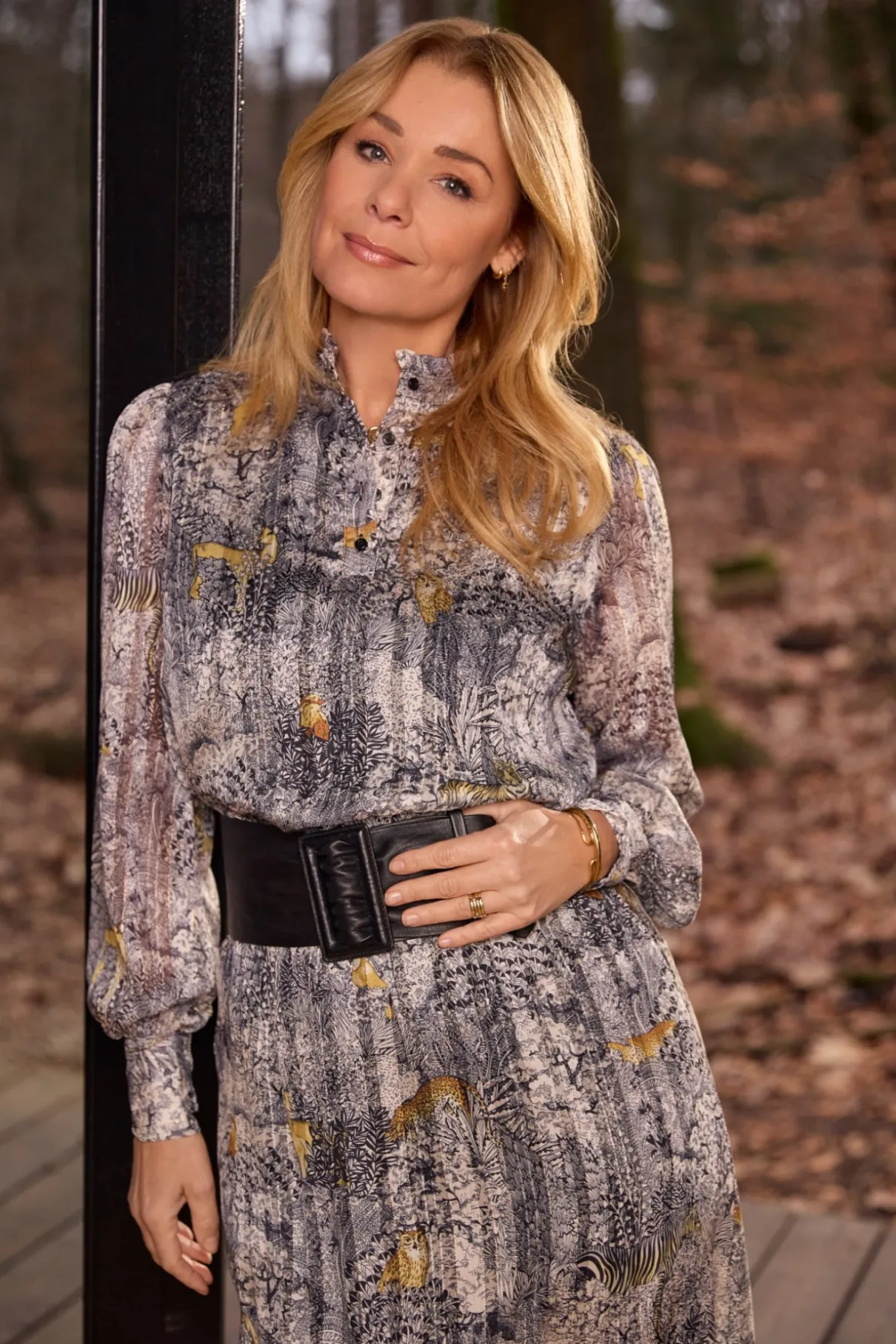 Eén van Froukje’s favorieten van deze winter is de Manisha blouse. Deze losvallende blouse is voorzien van een weelderig dessin, verwerkt met dierlijke elementen en een gouden glinstering. De blouse wordt gesloten middels een knoopsluiting en heeft een opstaande ruffle kraag.
