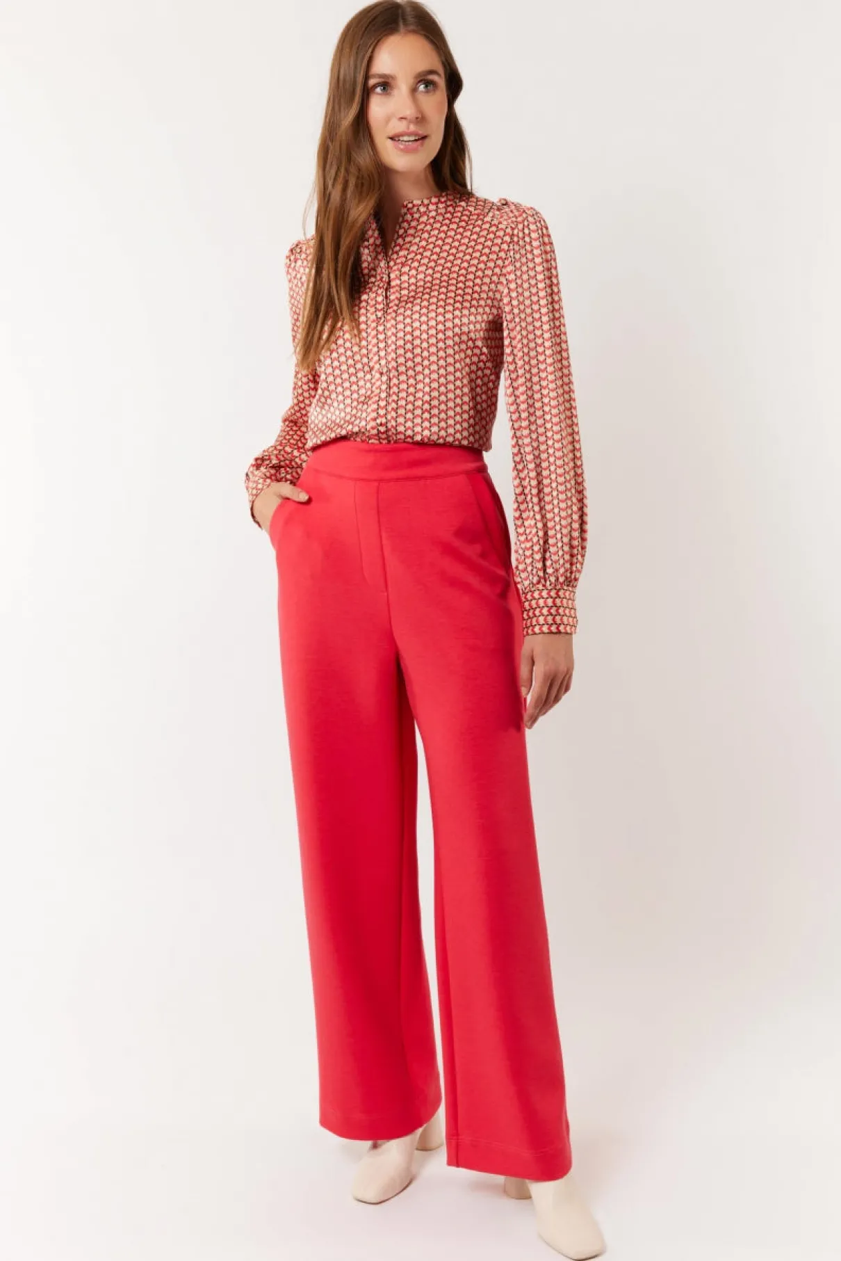 Eén van de meest comfortabele broeken van dit najaar is de Marije broek. Deze wijdlopende broek is gemaakt van een superzachte stof, dat comfortabel langs het lichaam valt. Deze chique loungebroek, met een hoge tailleband en steekzakken is verkrijgbaar in diverse kleuren en kan als compleet pak gedragen worden met de Eliane blazer.