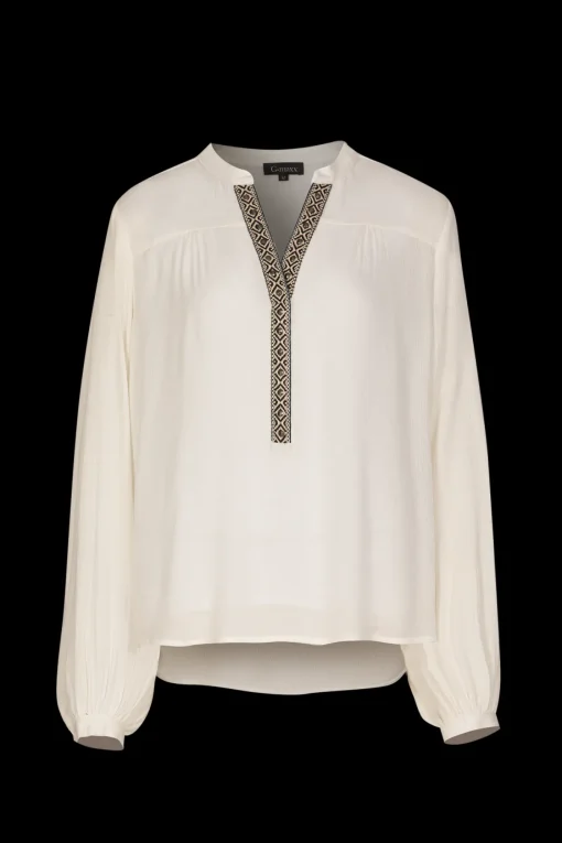 De Nyo blouse is een favoriet binnen de G-maxx zomercollectie. Deze blouse is namelijk gemaakt van een luchtig en losvallend materiaal, met een mooie V-hals en borderie in de halslijn en op de mouwen. Deze blouse is verkrijgbaar in het zwart en offwhite.