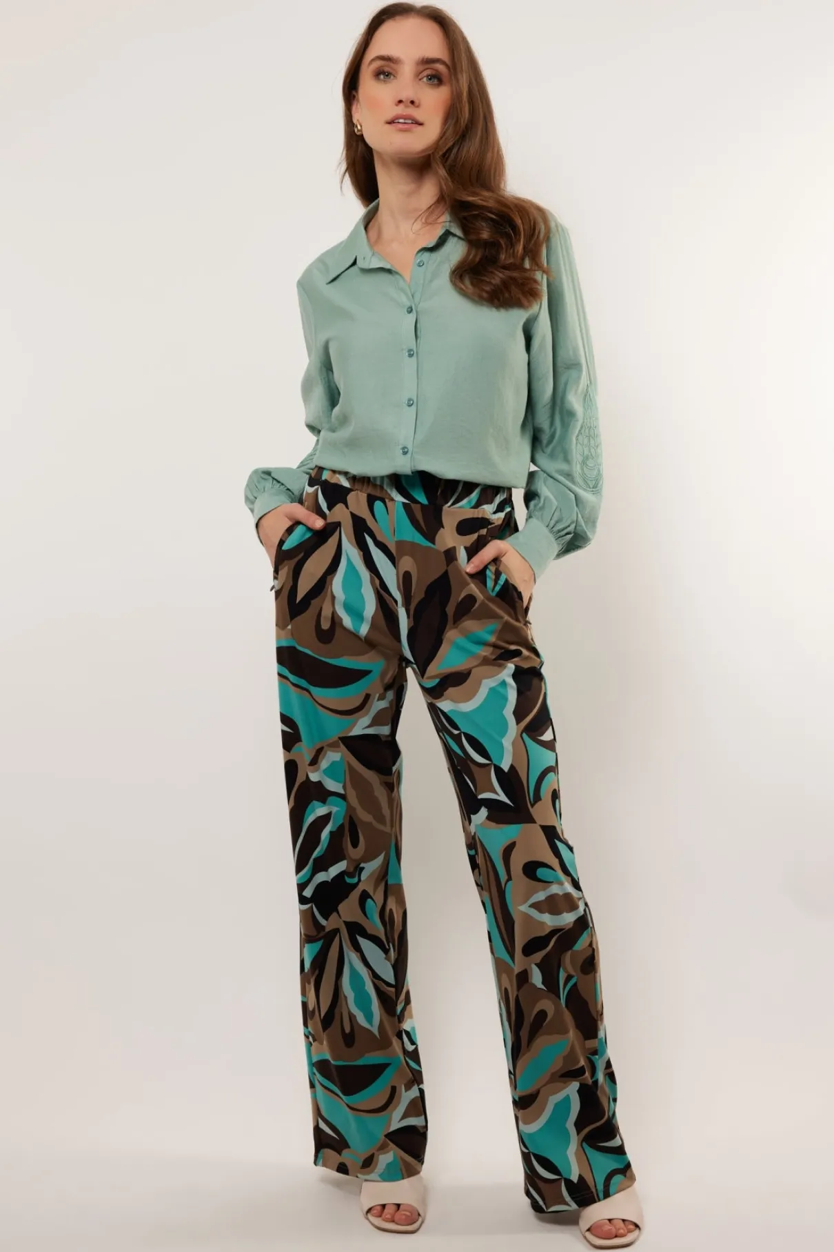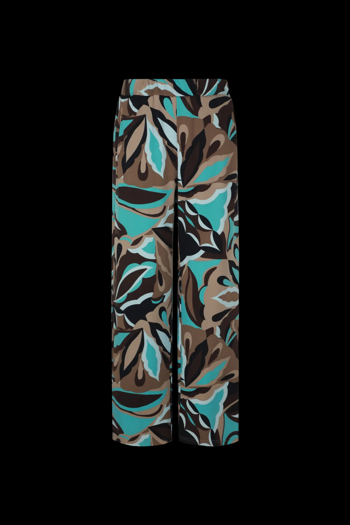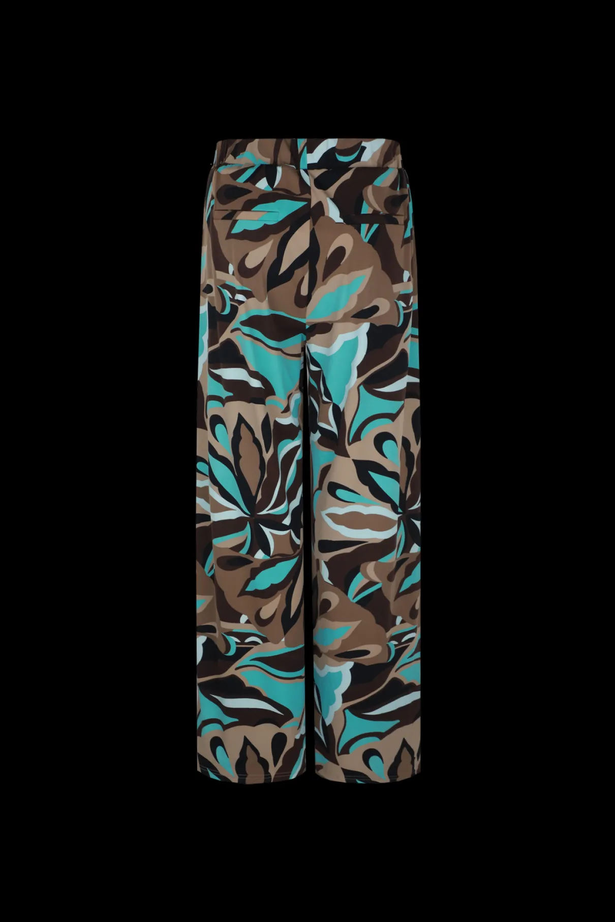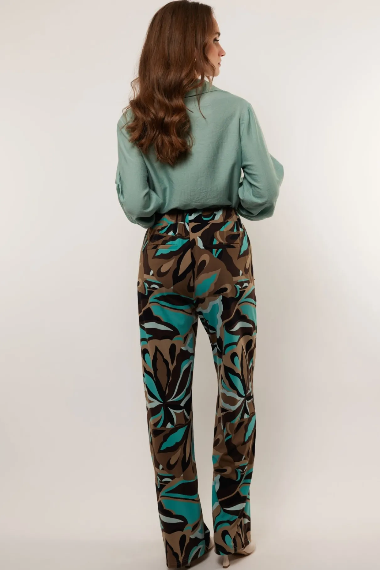Maak dit seizoen een stylish statement met de grafische print van de Tias broek. Deze broek heeft een aansluitend model met wijdlopende broekspijpen, steekzakken en een hoog draagcomfort door het gebruik van travelstof. Style deze broek met de Shanna top voor een complete set.